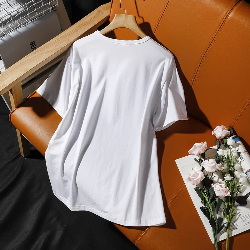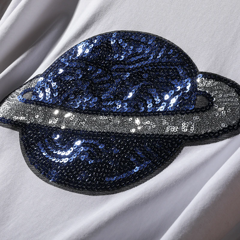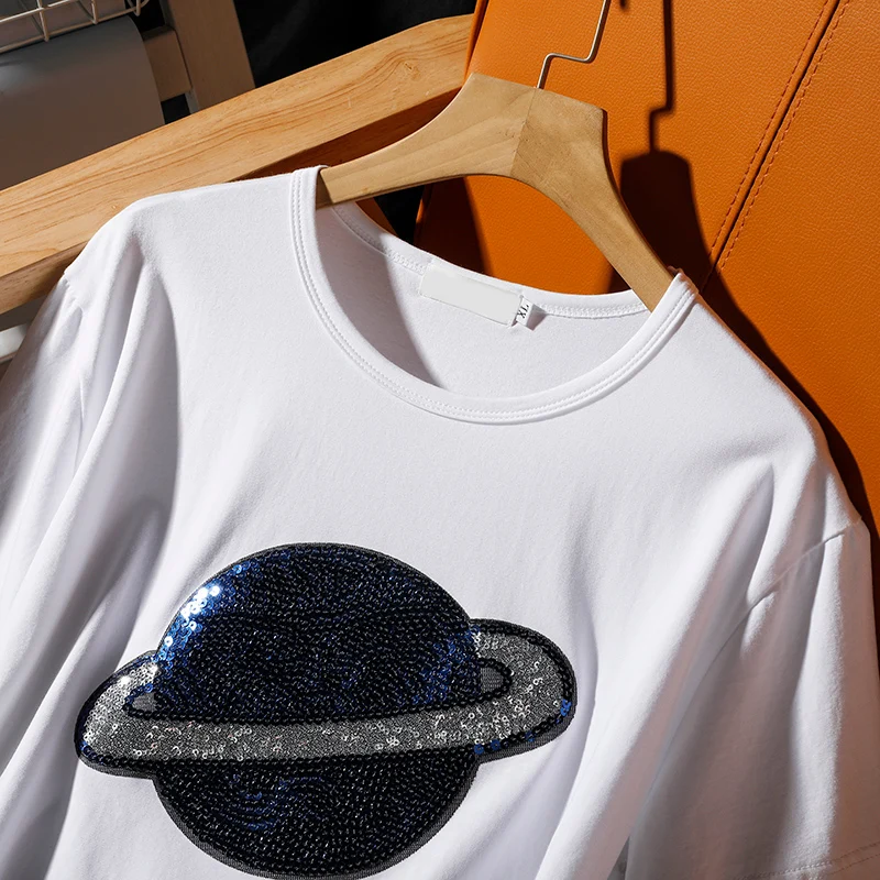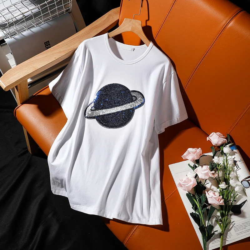 Футболка с короткими рукавами, женская летняя одежда, новинка 2021 года, корейская мода, планета с блестками, повседневная свободная, удобные белые женские топы
