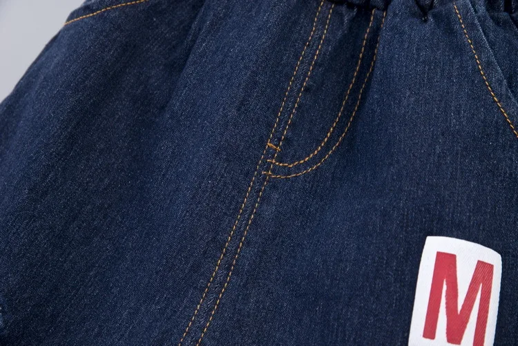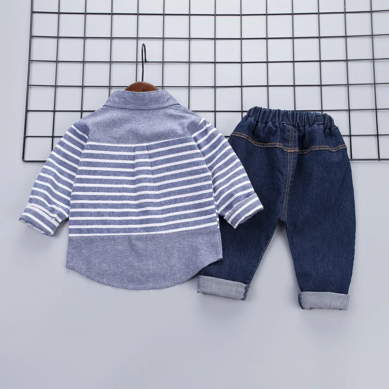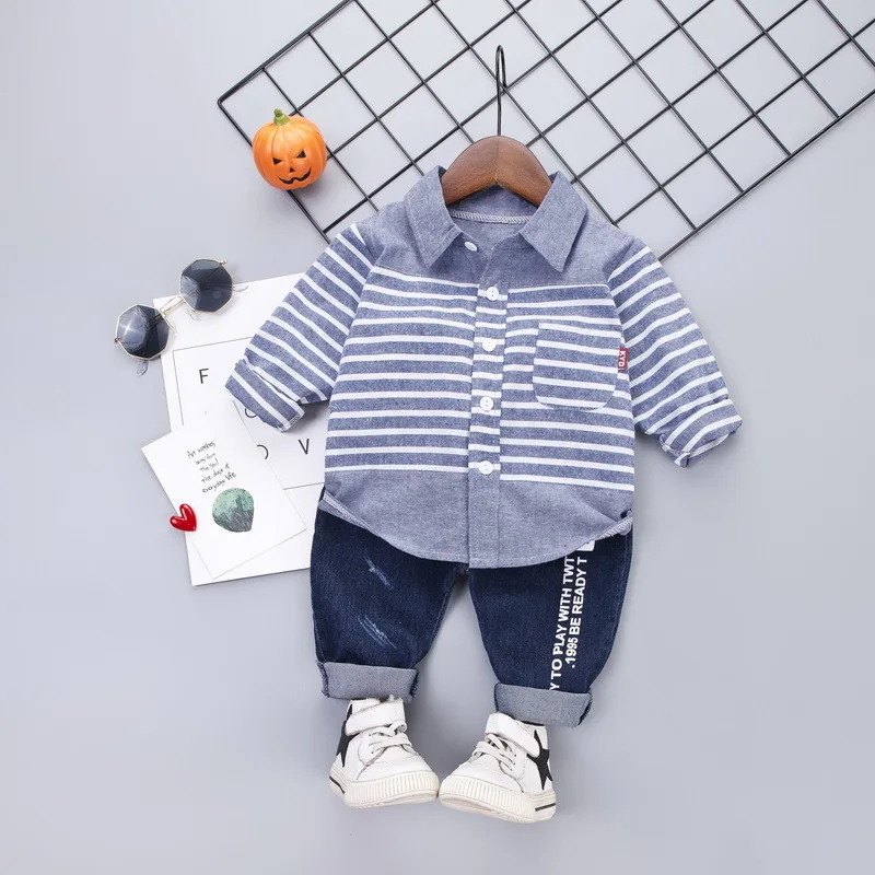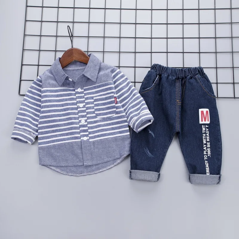 Новинка весны 2020, костюм для мальчиков, рубашка с длинным рукавом, джинсовый костюм, топ в полоску и брюки, комплект из 2 предметов, красный, синий цвет, для мальчиков