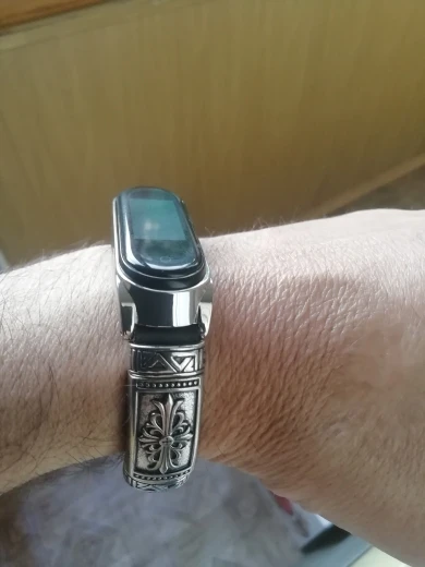 Заказываю второй браслет у этого же продавца. В первом сломалось крепление МI FIT с одной стороны. В целом браслет хороший. Серебрянка со временем стирается, но от этого он становится ещё более красивым. Жаль только, что крепление в первом сломалось за год. На фото 1 и 2 отвалившееся крепление. На фото 3 слева старый потертый браслет, справа новый.