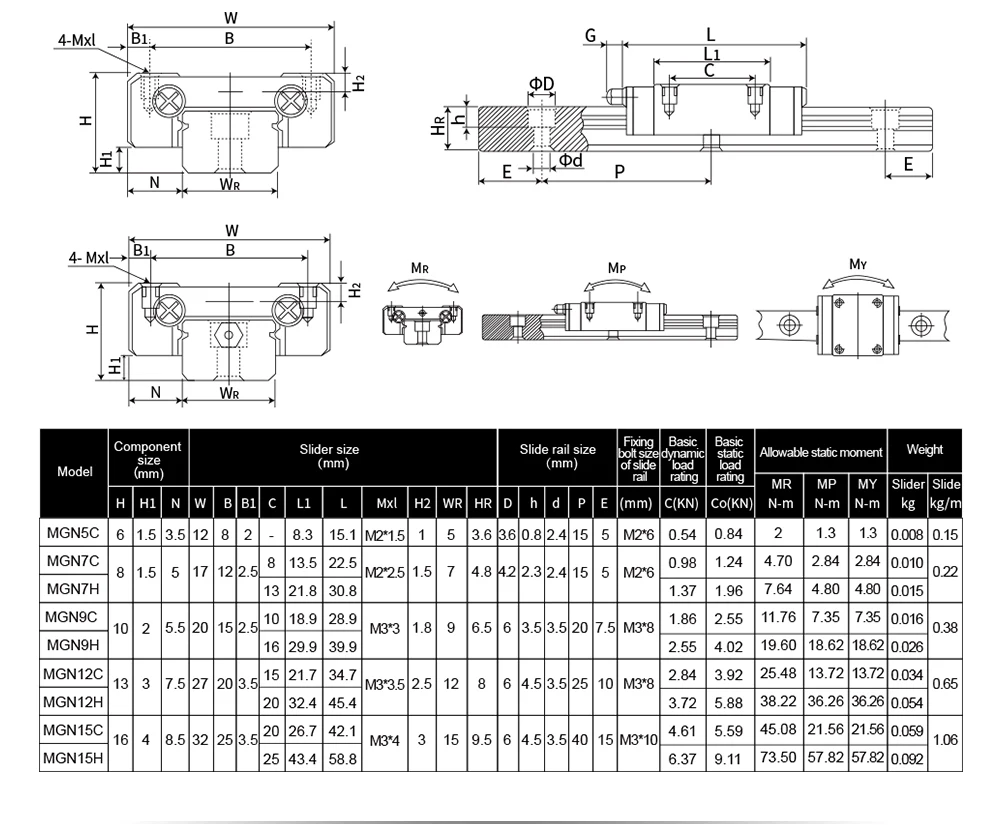Система смазки: MGN15 оснащена смазочным ниппелем на боковой стороне торцевой крышки, чтобы обеспечить клиентов смазкой, в то время как MGN7/9/12 отверстия для розлива масла защищены на боковой стороне торцевой крышки, который может вбивать масло или смазку в блок скольжения и смазывать.