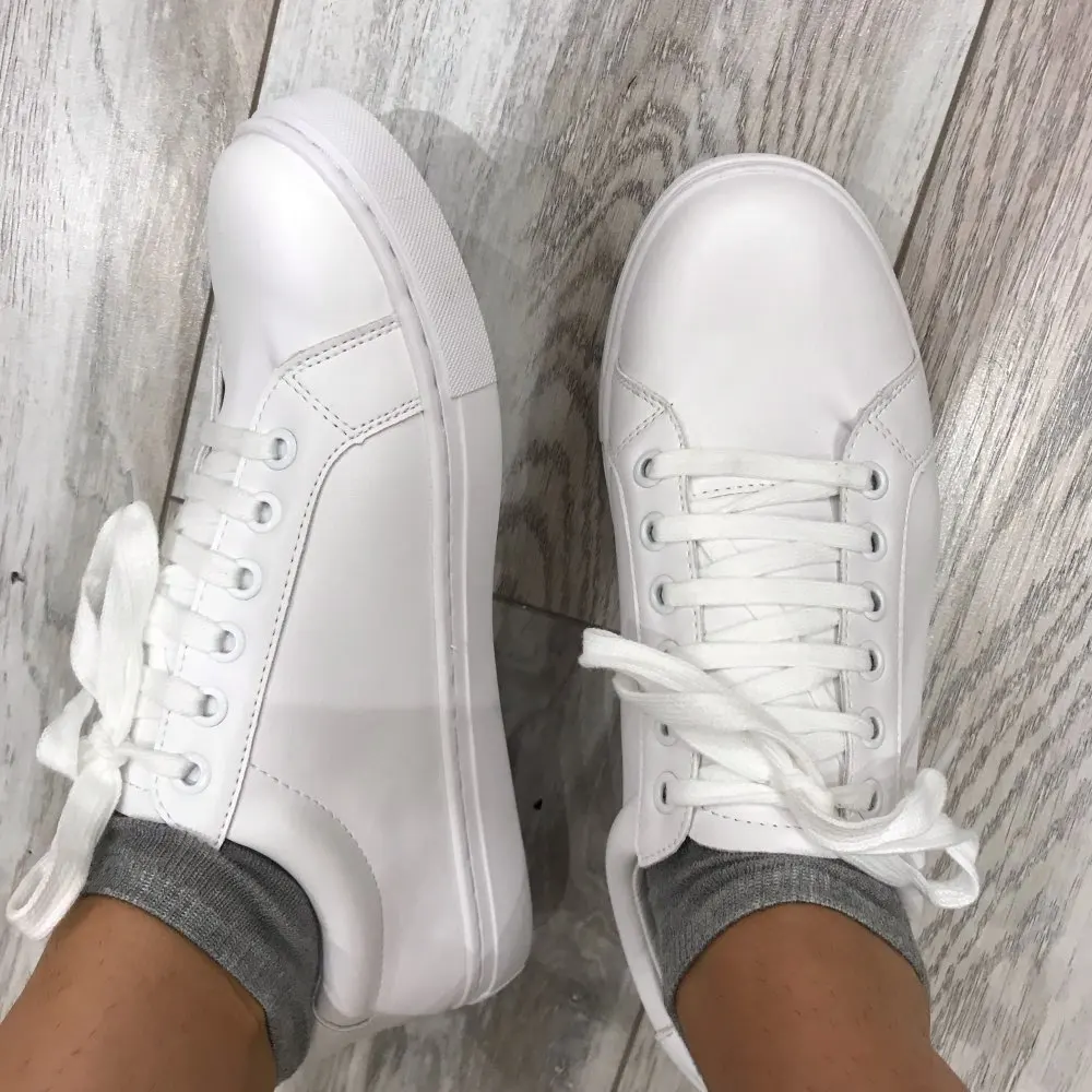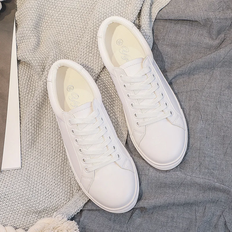 Кроссовки женские на платформе, Повседневная дышащая обувь на шнуровке, прогулочная обувь из искусственной кожи, плоская подошва, белые, Размеры 35-43
