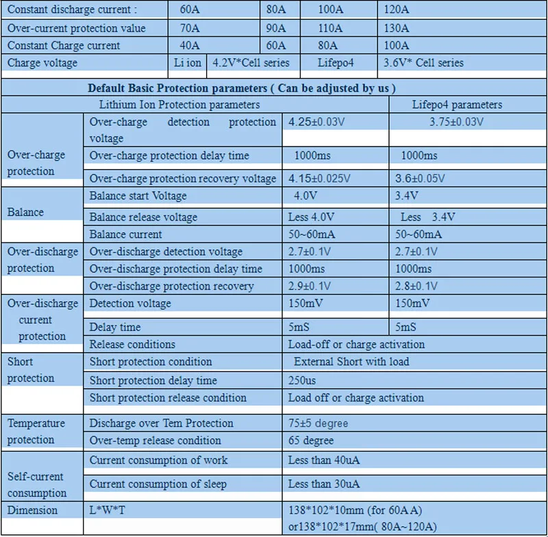 1) введение и особенности:Это интеллектуальная Защитная плата, специально разработанная для аккумуляторных батарей. Она может применяться к литиевым аккумуляторам с различными химическими свойствами, такими как литий-ионные, литий-полимерные. Литий-железо-фосфат и др. Защитная плата обладает высокой грузоподъемностью, а максимальный непрерывный ток разряда может достигать 120 А.● Защита клеток 3s или 4S серии для литиевого аккумулятора (3*4,2 = 12,6 в литий-ионный аккумулятор или 4*4,2 = 16,8 в литий-ионный аккумулятор и 4*3,65 = 14,6 в батарея Lifepo4), клиент может выбрать подходящий тип в зависимости от ваших характеристик батареи● Различные функции защиты для зарядки и разрядки (перезаряд, переразряд, защита от высоких или низких температур, защита от перегрузки по току, защита от короткого замыкания и т. д.) С двухслойной защитой оборудования и программного обеспечения.● Точный расчет SOC с функцией SOC автоматического обучения● Функция автоматической зарядки аккумулятора или функция статического баланса для аккумуляторной системы● Оснащен модулем Bluetooth с изолированным UART или RS485 и UART двойной связи, который может позволить пользователю просматривать информацию о батареях в нашем приложении или компьютерном программном обеспечении, которое может быть предоставлено нами. Клиент может использовать программное обеспечение ПК для гибкой установки параметров защиты, клиент может загрузить программное обеспечение по указанной ссылке.● С портом SW для управления выходомПокупатель может выбрать подходящую спецификацию, исходя из ваших требований, UART или Double (UART и RS485 ),LFP средства для применения батареи Lifepo4, пожалуйста, свяжитесь с нами, если у вас есть какая-либо деталь, с которой вы не сомневаетесь.