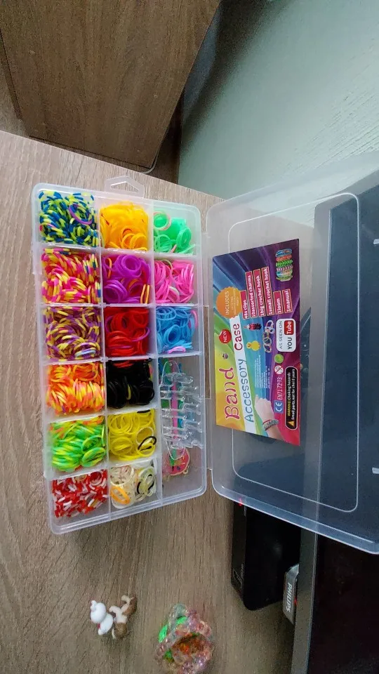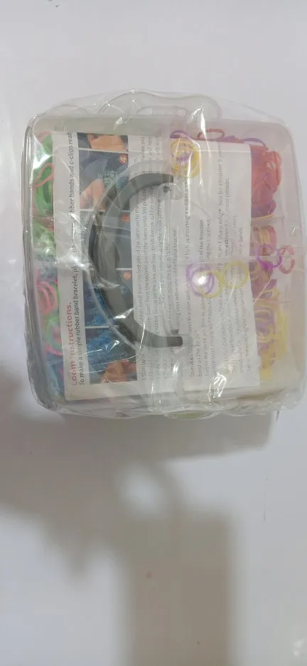 Коробка очень красивая и содержимое тоже! Есть много резинки всех цветов, блесток и несколько инструментов для изготовления браслетов! Таким образом, несколько детей могут веселиться! Спасибо за скорость отправки! Все было действительно хорошо упаковано в очень прочную пузырчатую пленку, также все прибыло в идеальном состоянии :)