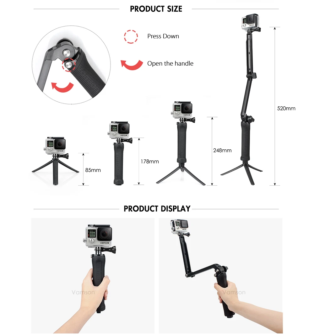 Складная конструкция рукоятки подходит для съемки видео POV или CAM, может быть как селфи-палка, обеспечивает высокое качество фотографии и монтажный кронштейн не появится в объективе