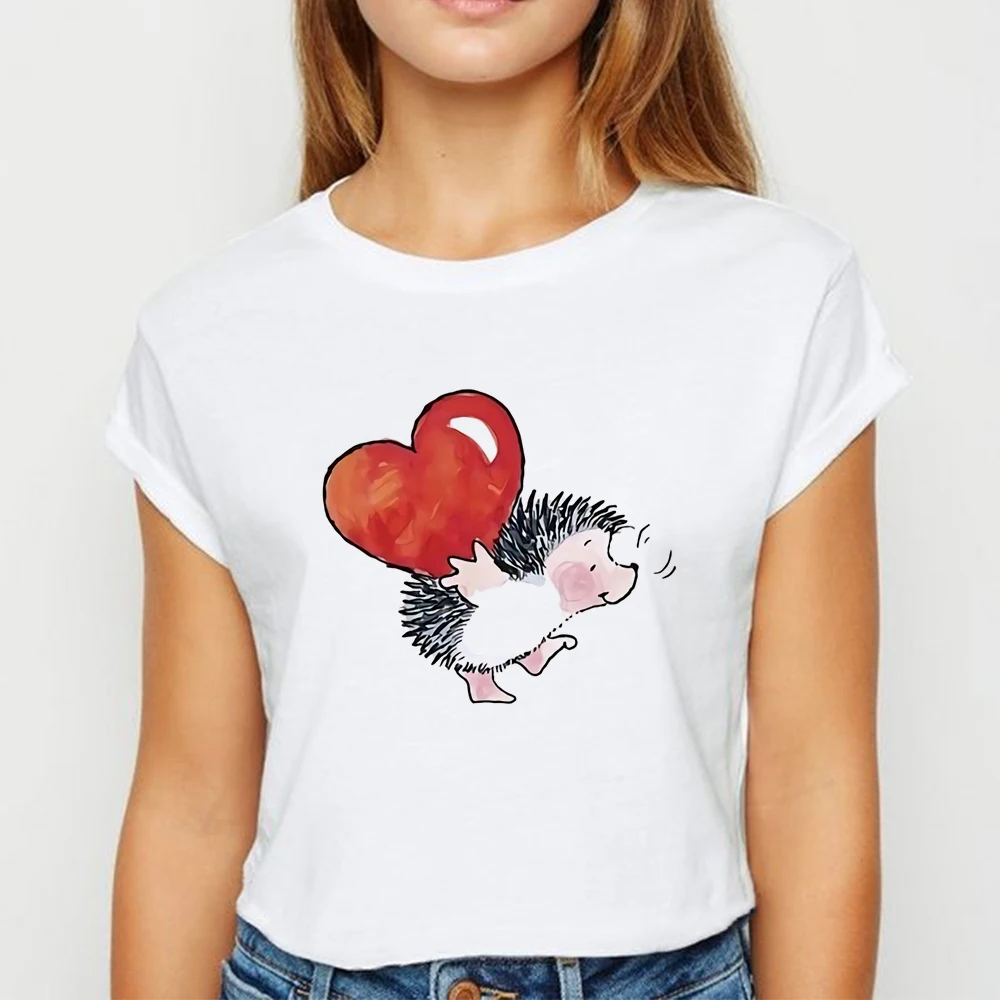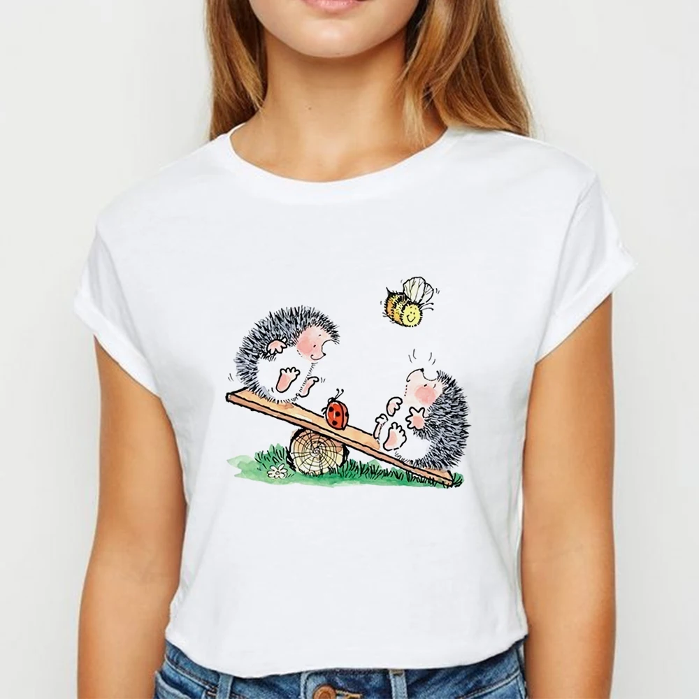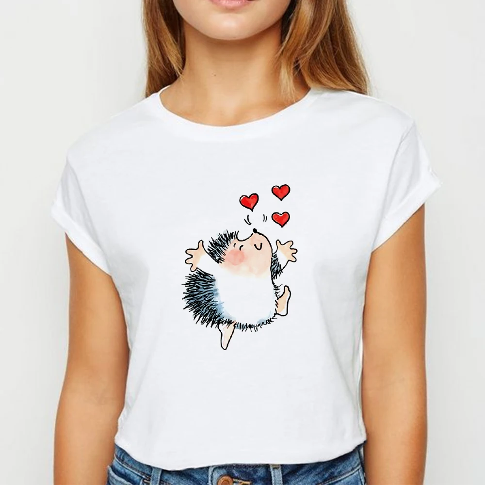 Футболка женская оверсайз с изображением ежика, милая рубашка на весну и лето, популярный топ с надписью, футболка с круглым вырезом
