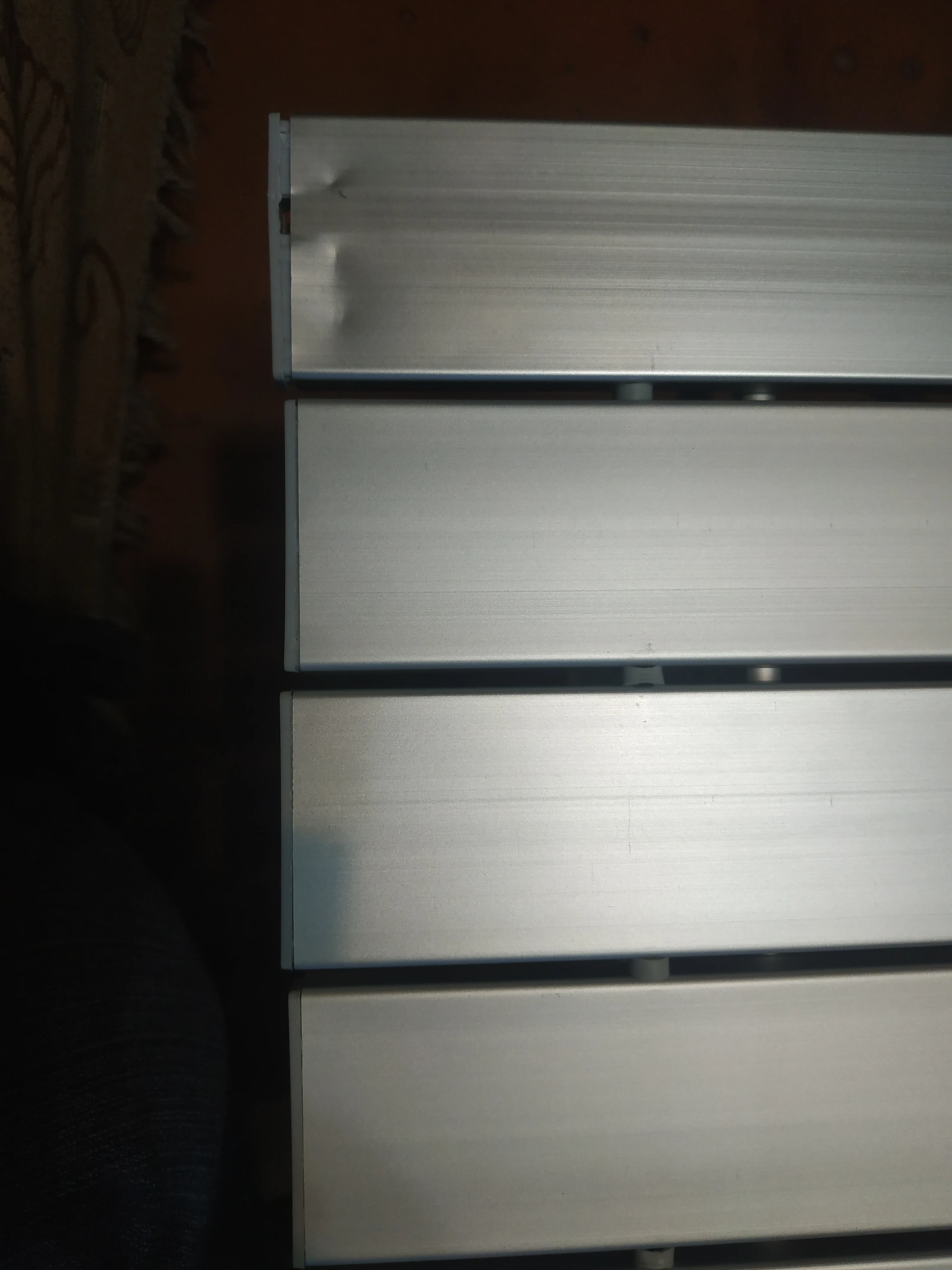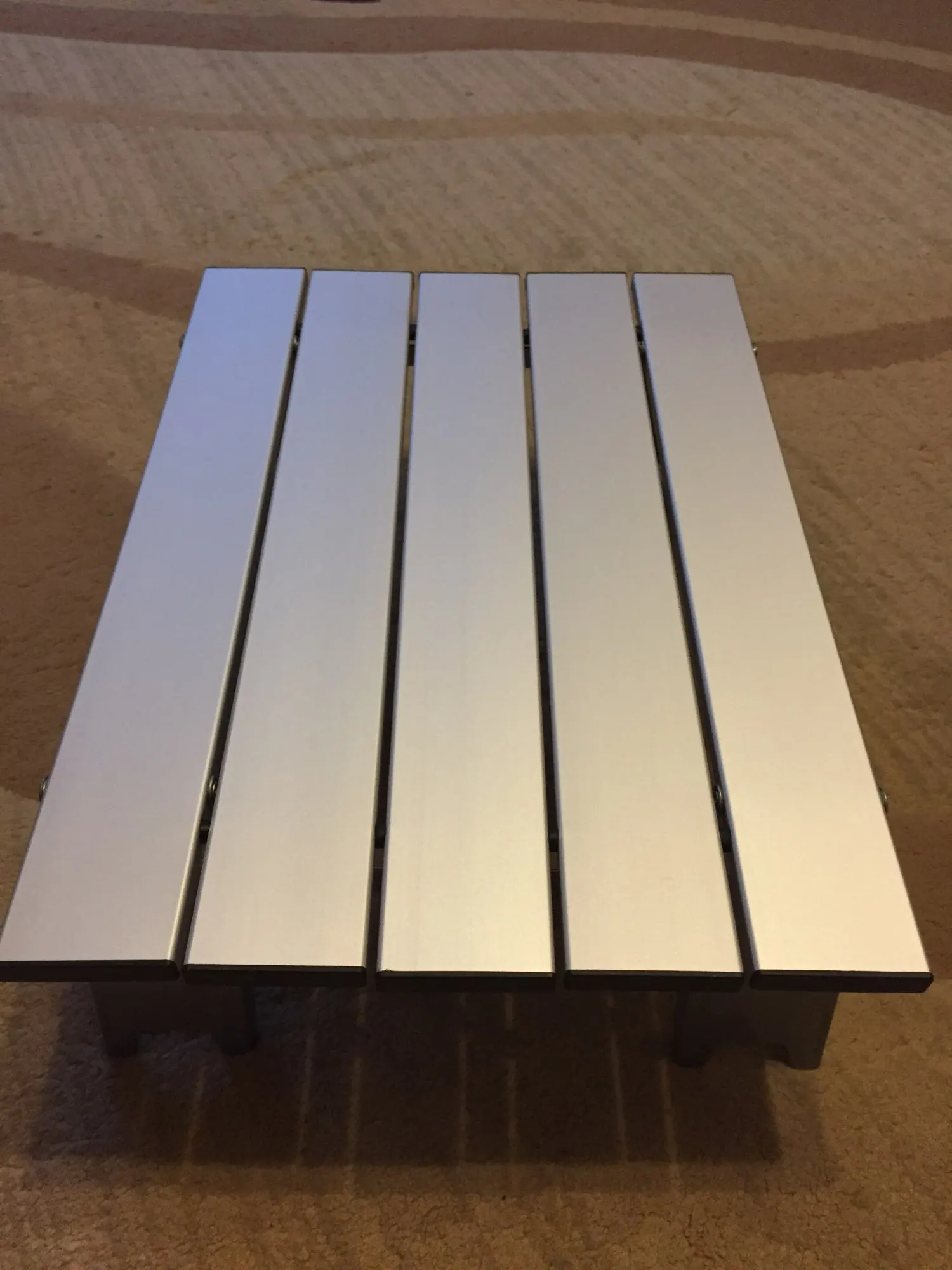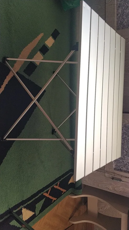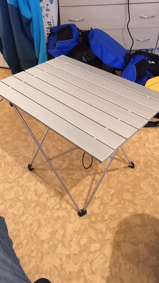 Ну, что я могу сказать.. Алюминий там похоже только в ножках. Сама столешница сделана из толстого формованного пластика. На одной из ламели небольшой изъян (отливка, покраска?). Ножки местами как-то странно пошарпаны, хотя стол должен быть новый. В собранном состоянии есть люфт ламелей столешницы. Собирается действительно быстро. Посмотрим как будет в эксплуатации. За что жирный плюс - это за упаковку. "Пупырки" не пожалели. Прям от души завернули. Тем более странными кажутся коцки на ножках.