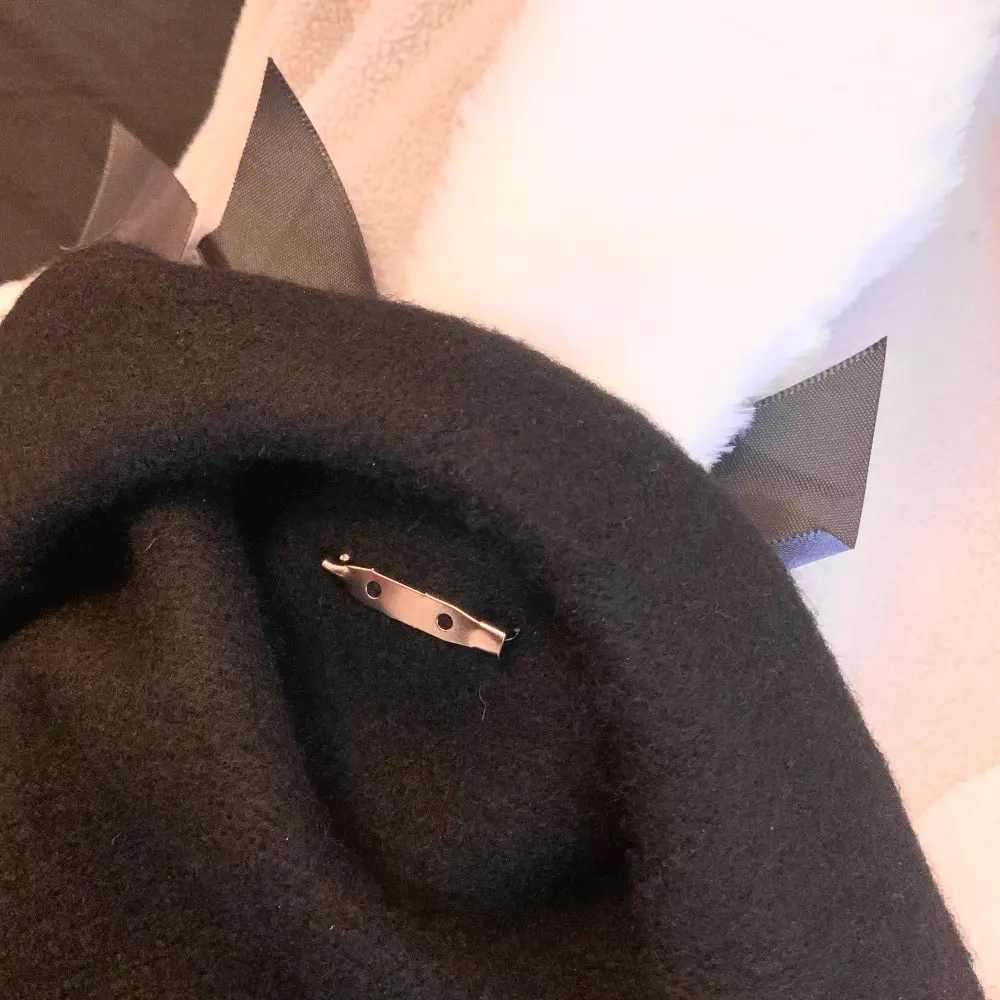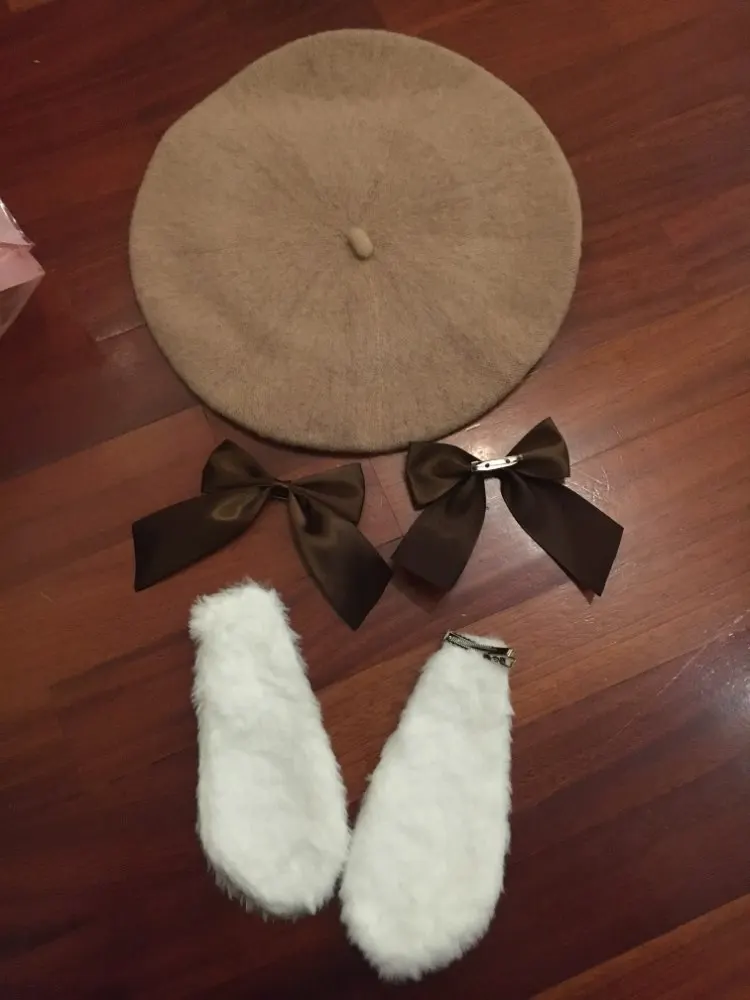 Это так мило! ~ Вы получаете 2 заколки и 2 зажима, уже прикрепленные к ушам, которые вы можете легко вынуть и 1 другую заколку для волос (idk, если это предназначено для 2). У бантов есть также булавки. Сначала я прикрепил банты к ушам, а затем прикрепил их все к шляпе, сняв булавку и сделав ее изнутри, чтобы она сохранялась лучше (последняя фотография)