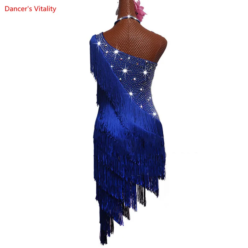 Платье для латинских танцев, женское платье со стразами, синее платье с кисточками, платье для румбы, одежда для сцены, Одежда для танцев для женщин
