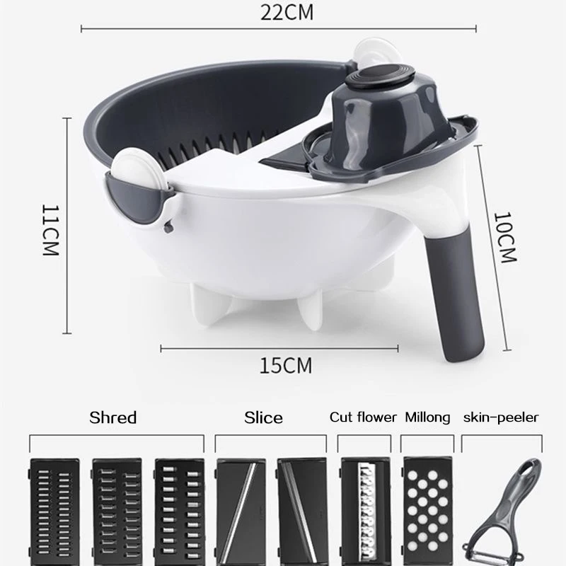 Простая и быстрая резка и очистка, вращающееся кольцо, автоматический угол поворота, корзина для битума всегда стабильна, легко моется за овощи и сливается.