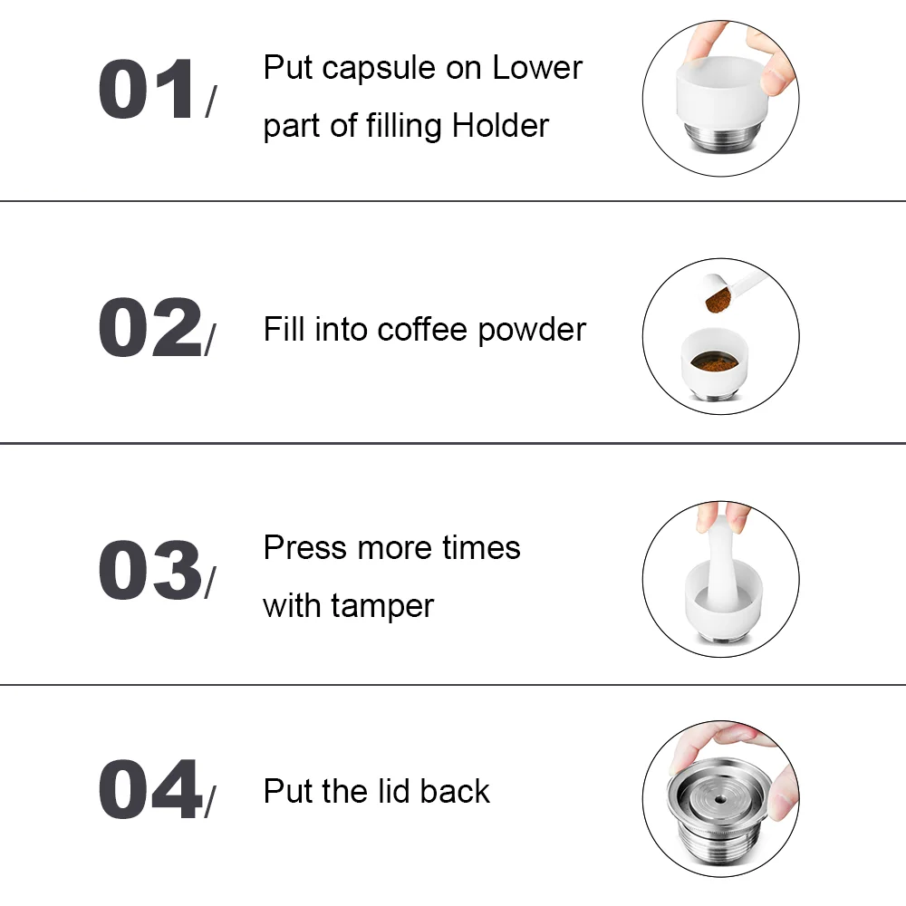 3. Используйте готовые, пожалуйста, снимите стальную капсулу, очистите и запасите. Примечание: Перед использованием убедитесь, что стальная капсула чистая, отверстия в крышке, нет питания кофе на суставе. Важно экспериментировать с правильным количеством кофе около 6 До 7 г (5g/ложка), а также обратите внимание на измельчение, которое не может быть слишком грубой или слишком тонкой. Пожалуйста, попробуйте несколько раз, чтобы найти правильный. Вы удивитесь, насколько хороший и кремовый кофе.