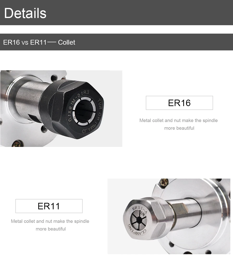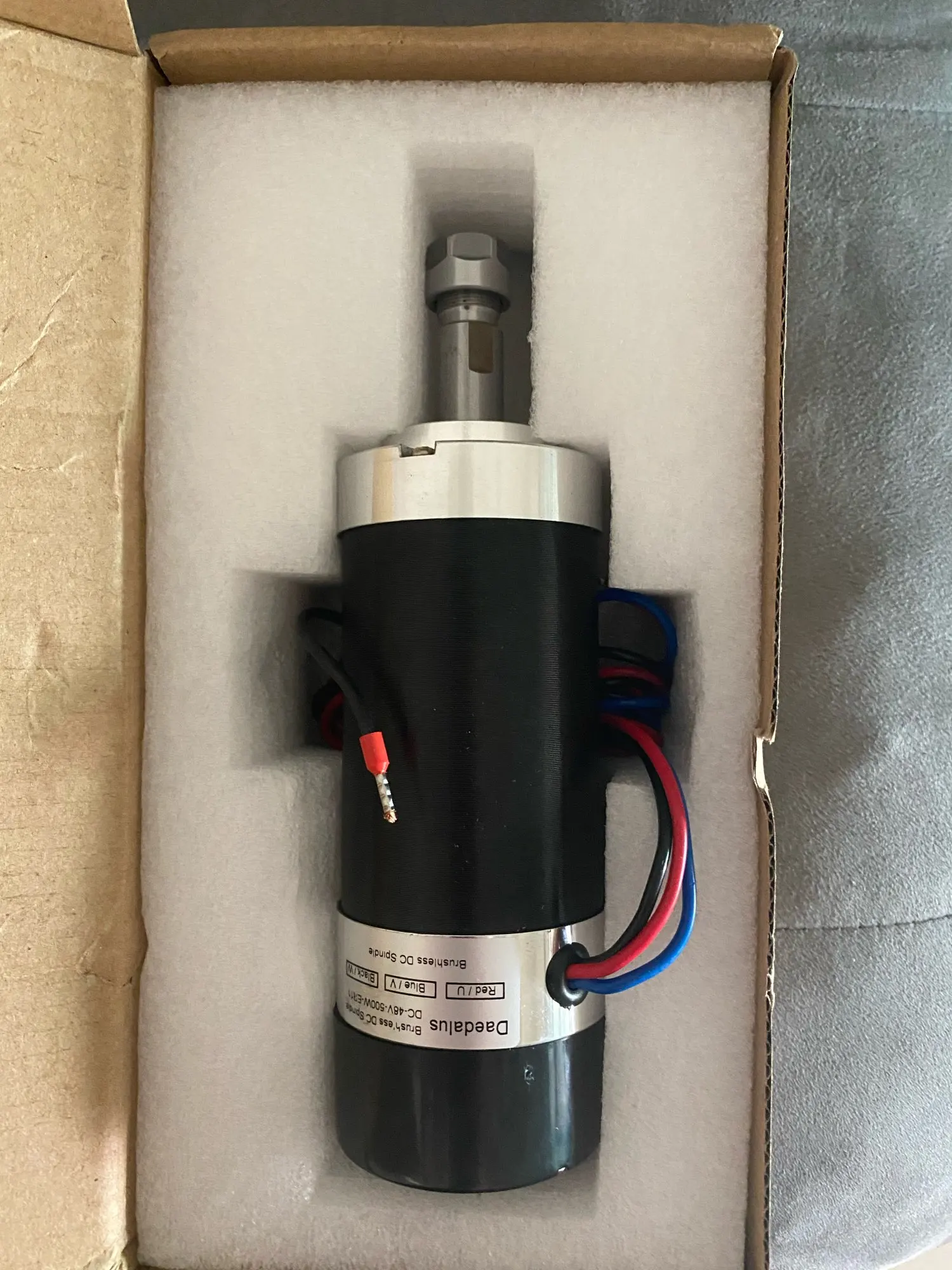 Получил в целом состоянии, упаковано качественно. Вал цельный с ротором и является непосредственно цанговым патроном ER11, в комплекте цанга 1/8. Очень качественно сделан, работает тихо, люфтов нет. Греется на максимальных оборотах, скорее всего это его нормальная рабочая температура. Отличный шпиндель, рекомендую к покупке!