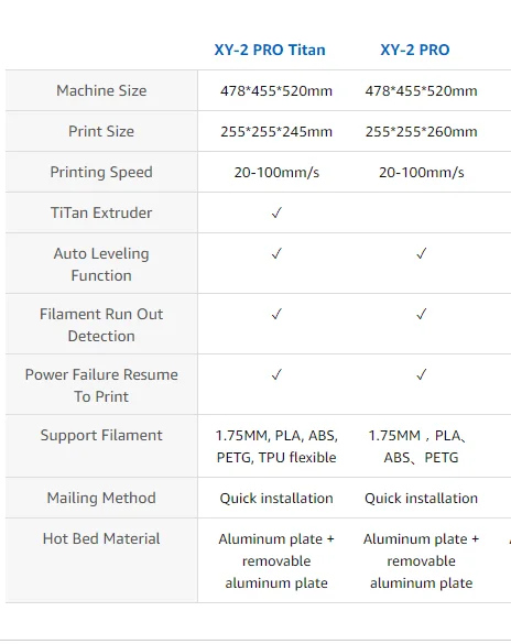 Максимальный размер печати: 255*255*260 мм(XY-2 PRO titan Размер печати: 255*255*245 мм)Цвет печати: однотонныйПринт Толщина: 0,1-0,4 мм (по желанию)Точность позиционирования: X/Y: 0,0125 мм Z: 0,02 ммРазмер насадки: 0,4 ммПоддержка материала: PLA, ABS, HIPS, WOOD, PC, PVC(XY-2 PRO titan также поддержка: TPU)Материал машины: алюминий и металлМашина Вес: 8,5 кгВес упаковки: 11 кгРазмер упаковки: 495x460x220ммРазмер машины: 460x450x510ммЭкран: 3,5 Полноцветный Сенсорный экран ЭкранАвто Уровень: включенВходная мощность: 110 В/220 ВВыходная мощность: 24 В 360 ВтАутентификация: CE FCCПрограммное обеспечение для нарезки: слайсер TronxyФормат файла: STL, OBJ, DAE, AMF, G-CodeПрограммное обеспечение: Repetier-Host, CuraОперационная система: Windows/MacOS/LinuxПодключение: USB интерфейс, tf-картаСбой питания: включенДетектор износа нити: в комплекте