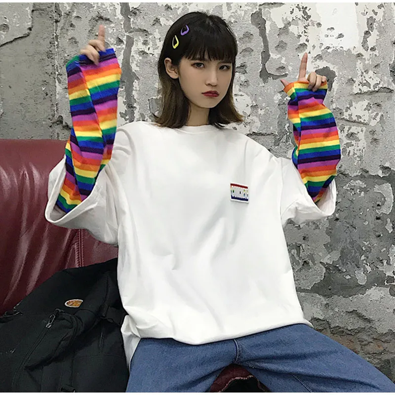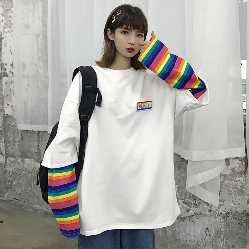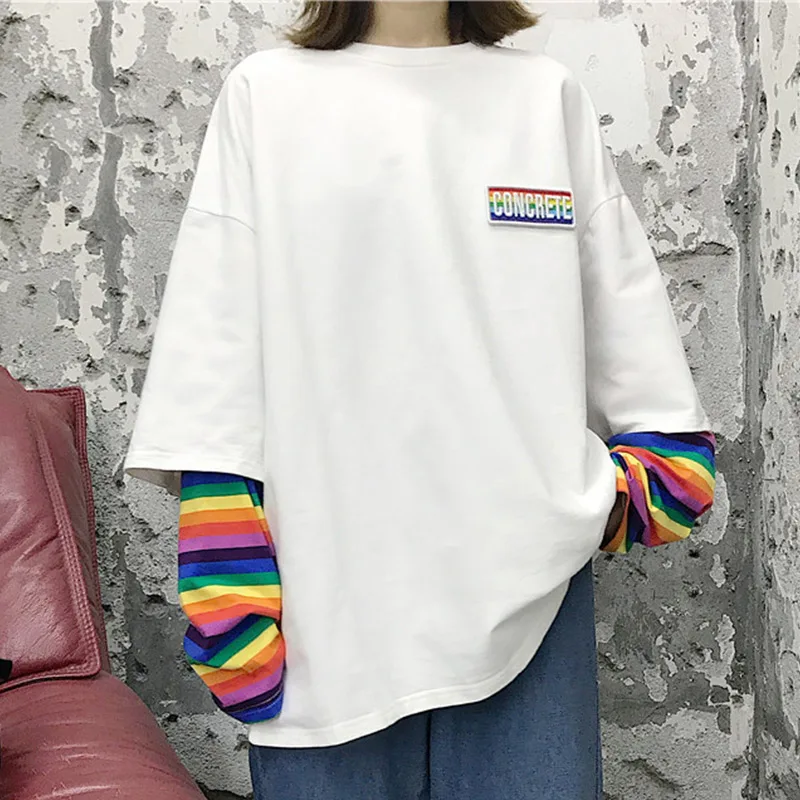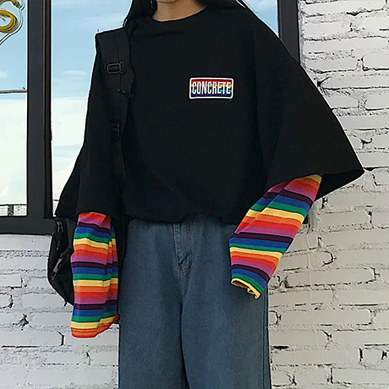 Женский свитшот с имитацией двух предметов, в радужную полоску, с длинным рукавом и буквами, в стиле пэчворк, весна 2021