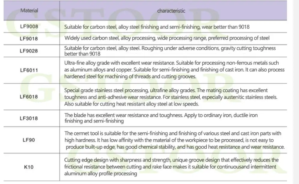 LF6018: специальные классы для обработки нержавеющей стали, классы сверхтонкого сплава, с отличной прочностью и устойчивостью к сцеплению с покрытием, подходят для обработки нержавеющей стали, особенно аустенитной нержавеющей стали, А также подходит для резки жаропрочной легированной стали на низких оборотах
