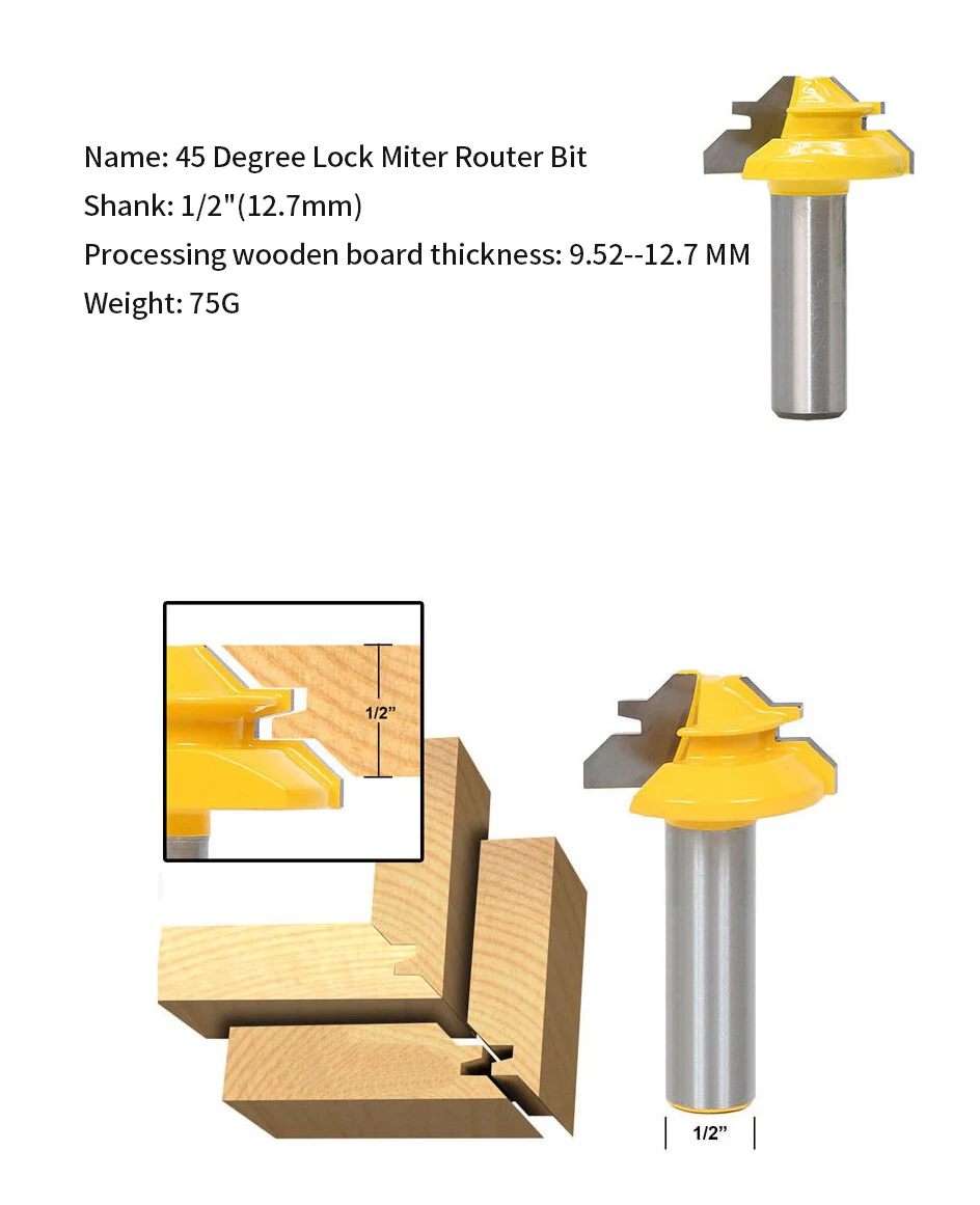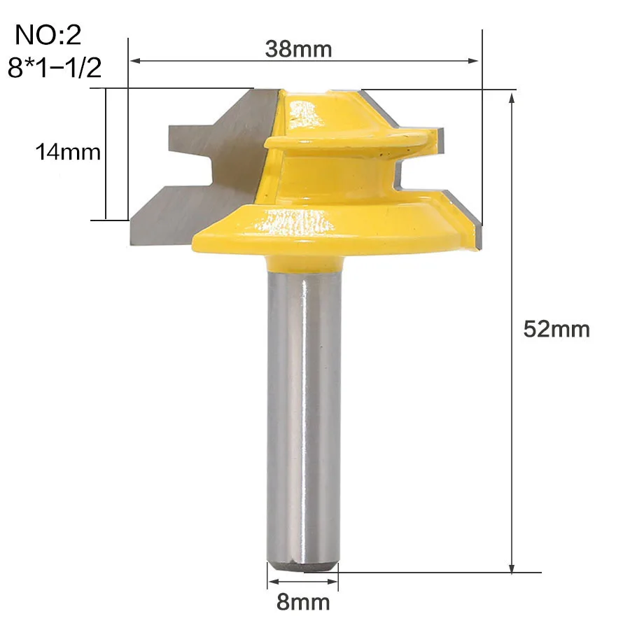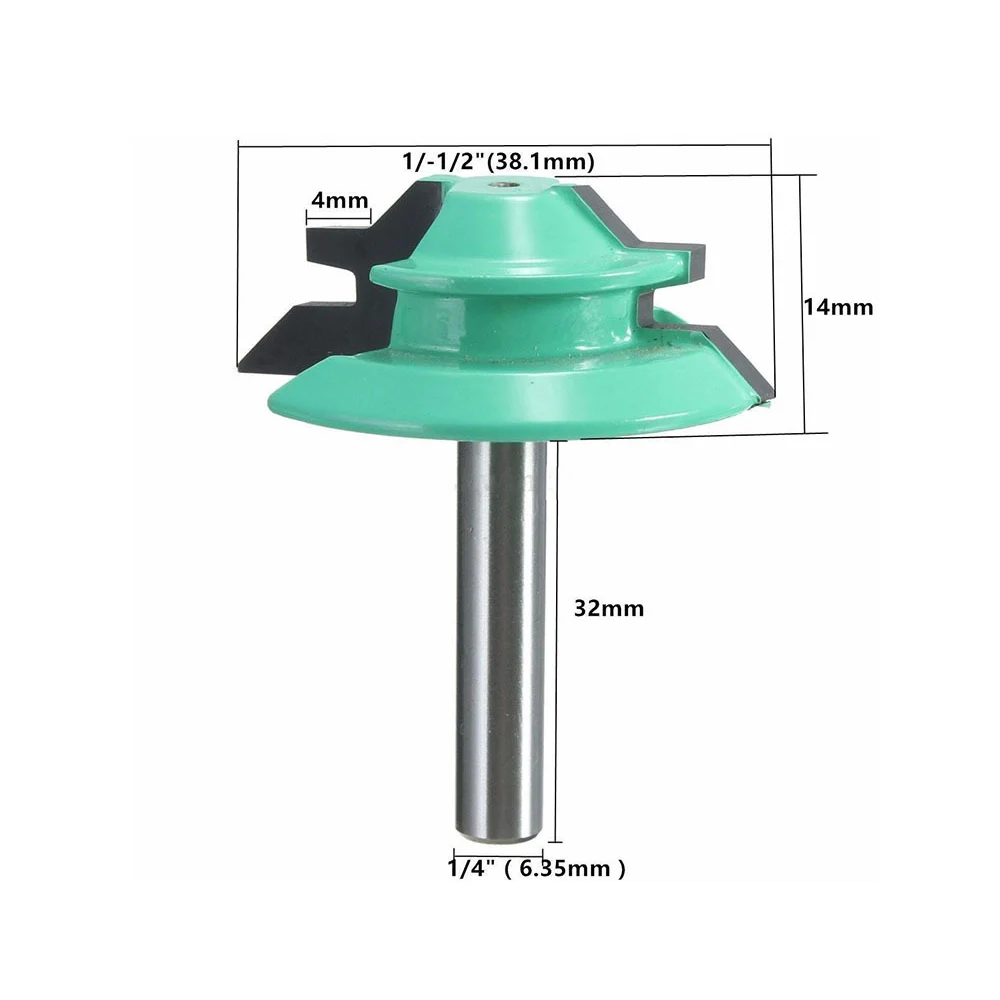 . Подходит для: МДФ, твердой древесины, МДФ, ДСП, фанеры, деревянных дверных рам, деревянных оконных рам, шкафов и коробок и т. д. . Острый край, высокая твердость, точное позиционирование, высокая точность, гладкая резка, ударопрочность, высокая прочность. . Выбор лезвия из сплава высокого качества делает лезвие более острым и прочным. . Лезвие промышленного класса микро карбида зерна. . Крюк и ножницы углы высокий крюк и ножницы углы позволяют резакам плавно нарезать на складе, производя чистый, без швов. . Покрытие, запеченное на термостойком покрытии, предотвращает образование опилок, смолы и шаг. . Применимые модели: бакелитовый фрезерный станок, гравировальный станок, Гравировальный и фрезерный станок, станок для обрезки, компьютерный гравировальный станок, вертикальный триммер. Спецификация: . Используйте Реверсивный 45 ° блокировочный клеевой шарнир для соединения плат на 90 °. Блокировка 45 ° разрезов будет производить чрезвычайно сильные соединения без необходимости бороться, чтобы держать доски на месте во время зажима. Кроме того, он обеспечит дополнительную склеивающую поверхность, что приведет к чрезвычайно прочному и прочному соединению. При правильном положении, бит будет вырезать оба куска на складе без необходимости регулировать бит. Просто установите центр на складе до центра бита. Затем вырежьте один кусок горизонтально, а второй-вертикально.