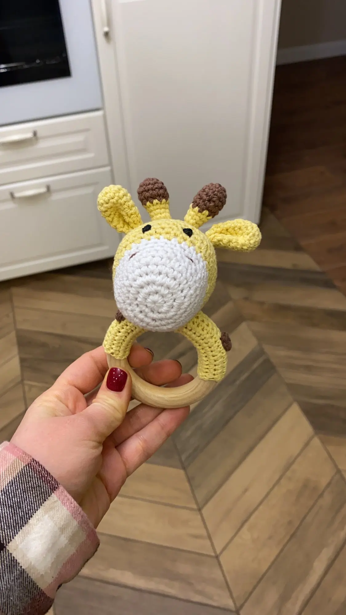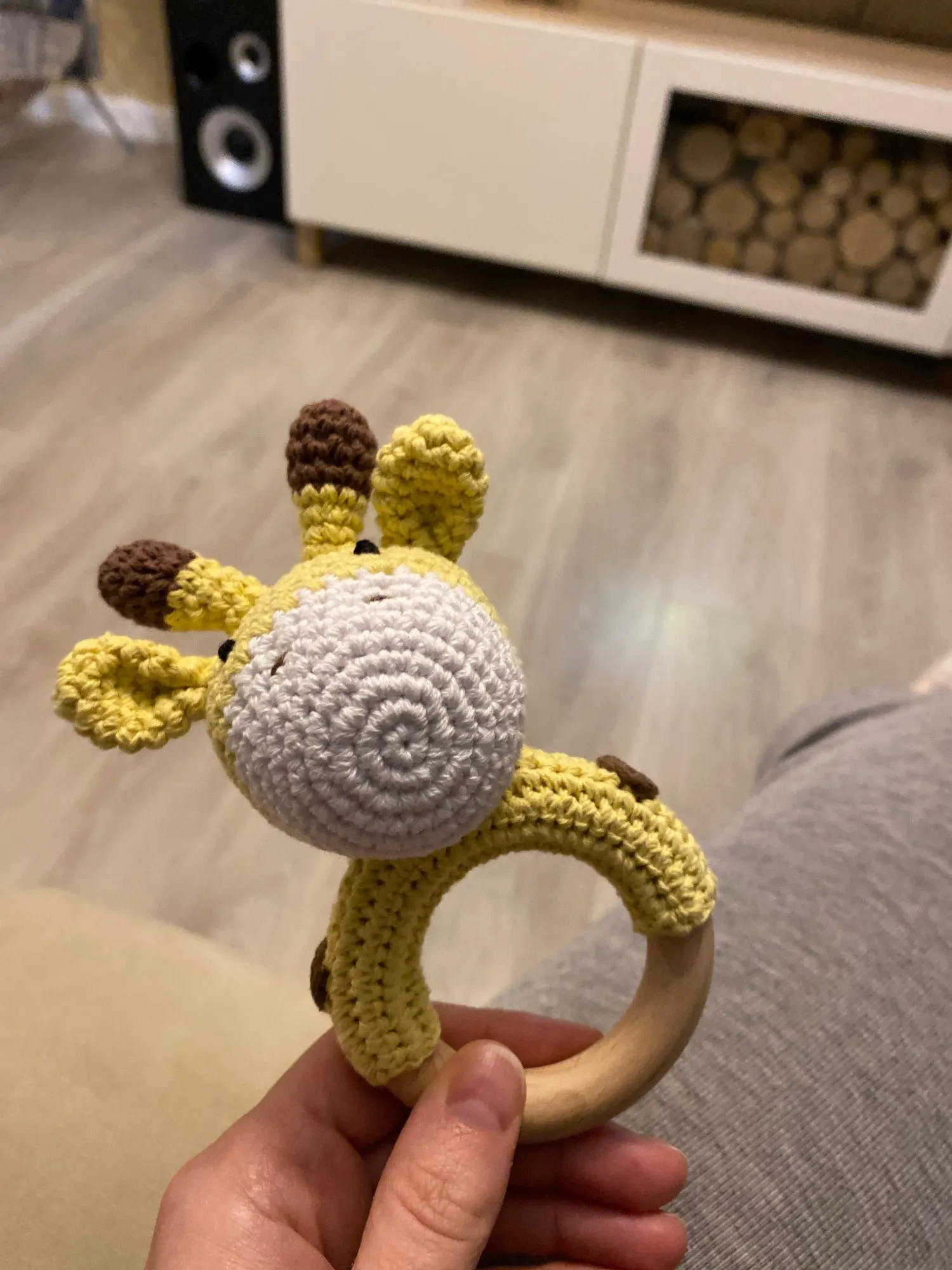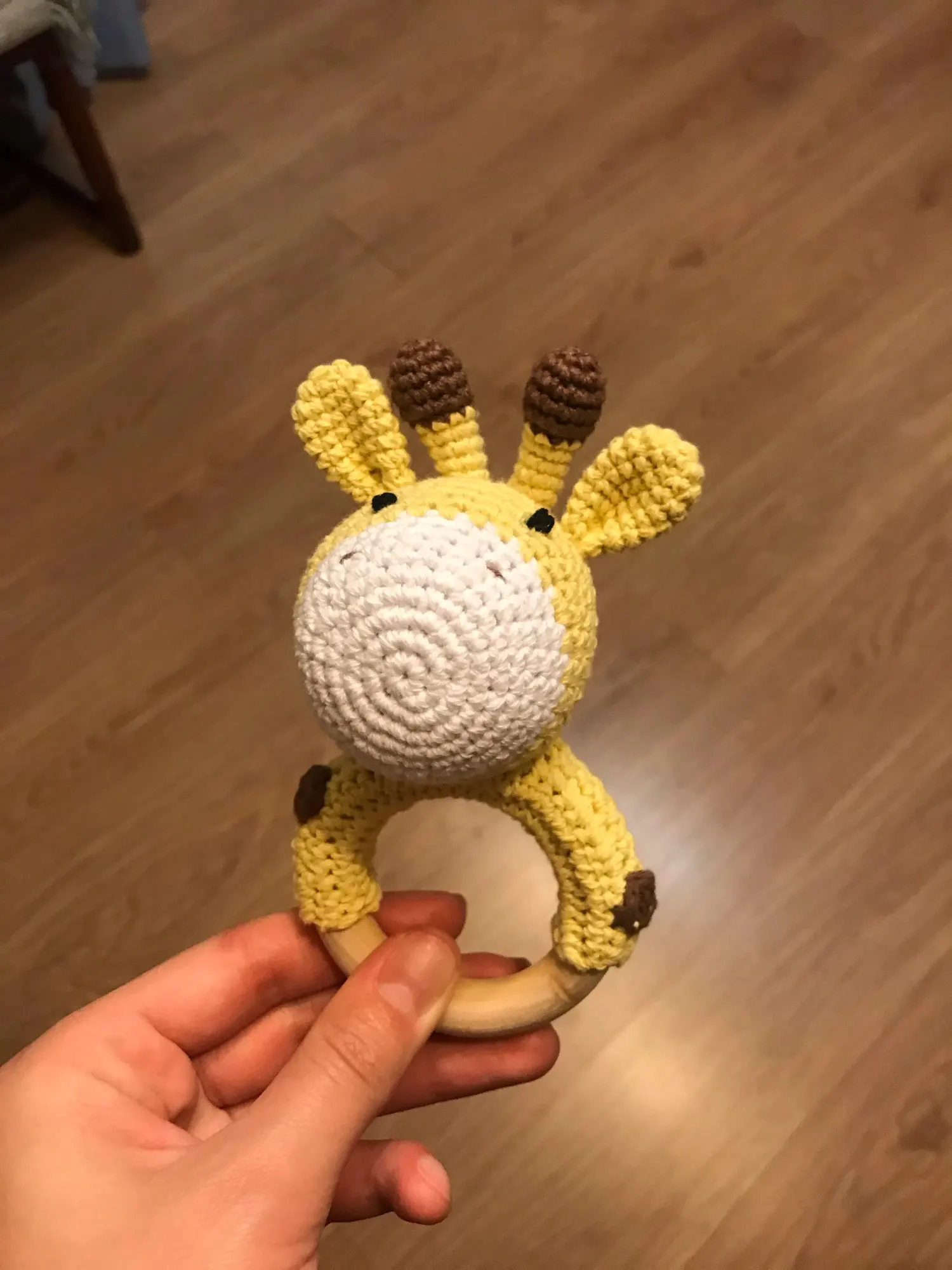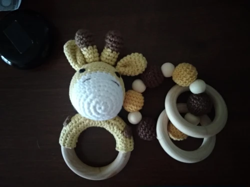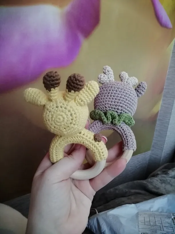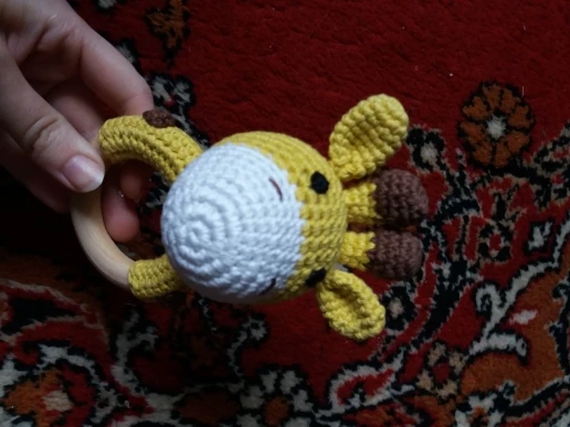 Игрушка класс! Сделана аккуратно. Цвет жёлтый, но не вырви глаз. Колечко деревянное, снаружи гладкое, с внутренней стороны чуть-чуть шершавое, но без заноз. Мордочка жирафа мягкая, внутри колокольчик, так что можно использовать как погремушку. Немного торчат синтепоновые нити сзади. Размер 14,5 * 7,5 см. Без запаха. Посылка пришла за месяц