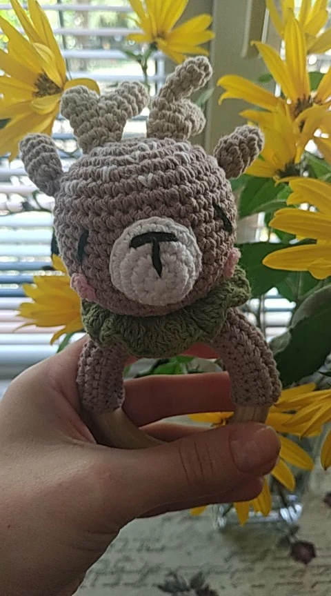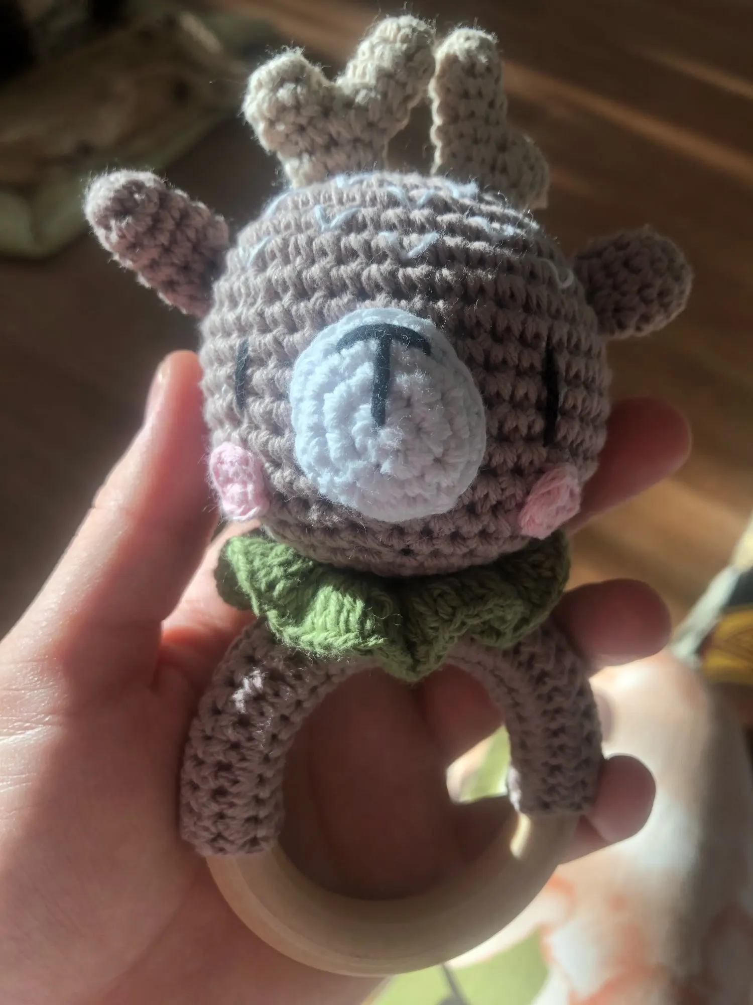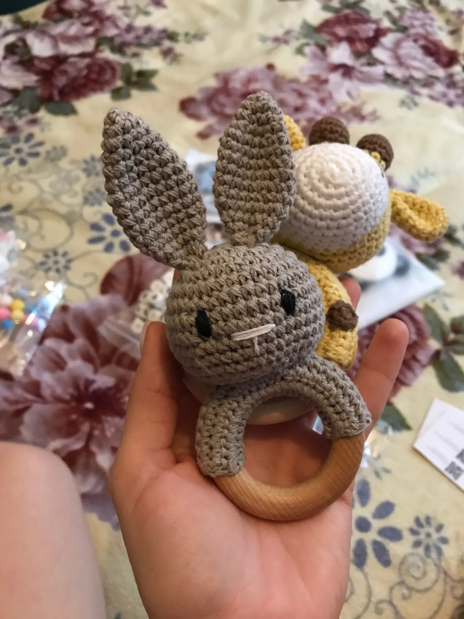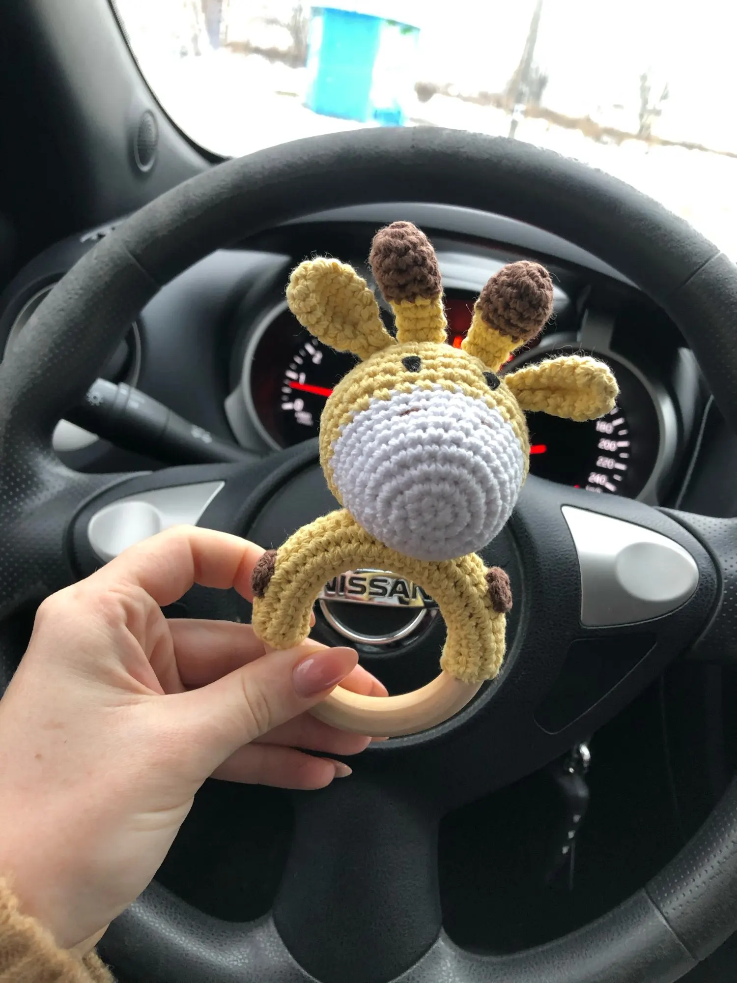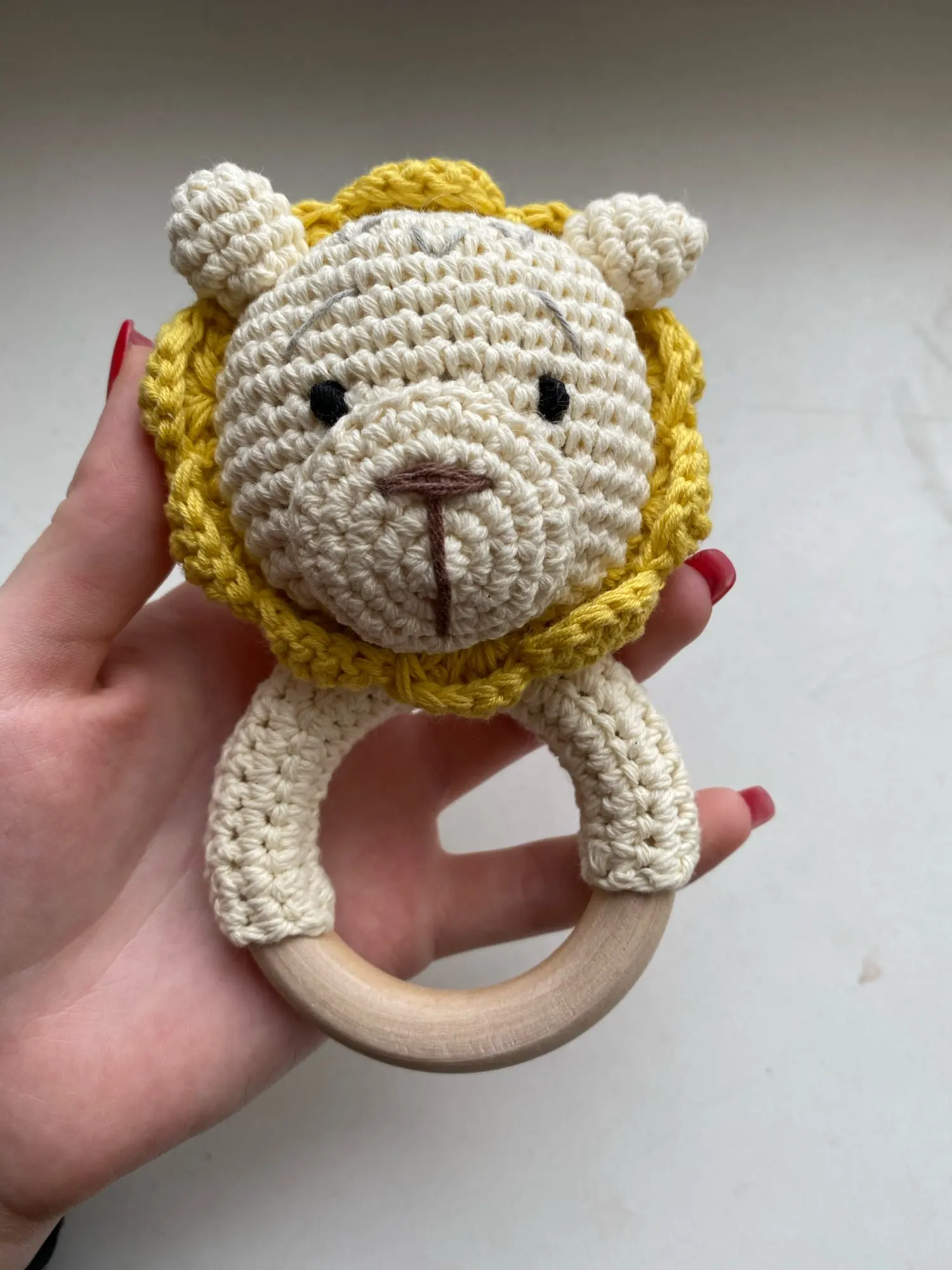 Игрушка класс! Сделана аккуратно. Цвет жёлтый, но не вырви глаз. Колечко деревянное, снаружи гладкое, с внутренней стороны чуть-чуть шершавое, но без заноз. Мордочка жирафа мягкая, внутри колокольчик, так что можно использовать как погремушку. Немного торчат синтепоновые нити сзади. Размер 14,5 * 7,5 см. Без запаха. Посылка пришла за месяц