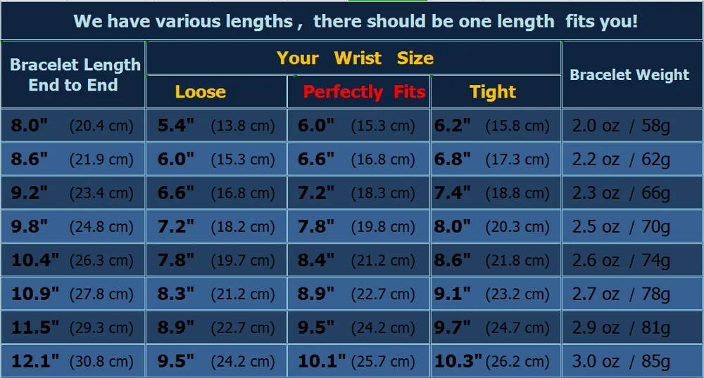 Как выбрать правильный размер? 1:Измерьте размер запястья. (Пожалуйста, посмотрите на последнюю картинку, в которой показано, как измерить запястье) 2:Пожалуйста, посмотрите на таблицу размеров ниже и убедитесь, что ваш размер близок к «Идеально подходит», размер запястья, тогда вы будете знать, какая длина браслета подходит для вас (Если вам нравится браслет, более свободный, пожалуйста, убедитесь, что размер запястья близок к размеру свободного размера)