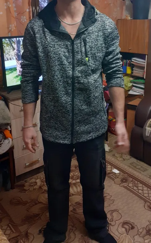 Отличная толстовка. Сама толстовка флисовая, капюшон на подкладке. Сшита хорошо, на меня (192см 118 кг) села отлично. Тот случай. когда одежда из Китая не разочаровала ни размером, ни качеством.