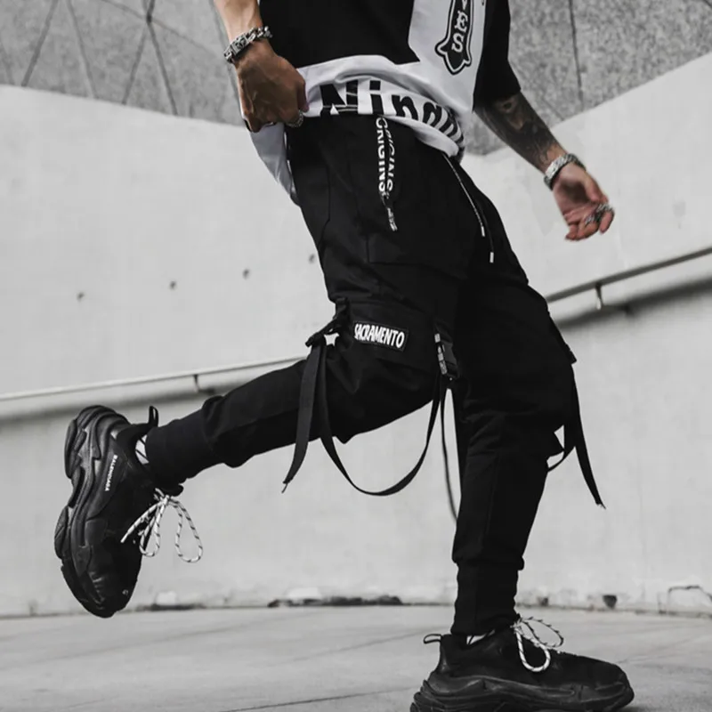 2019 Весна хип-хоп Джоггеры мужские черные шаровары многокарманные ...