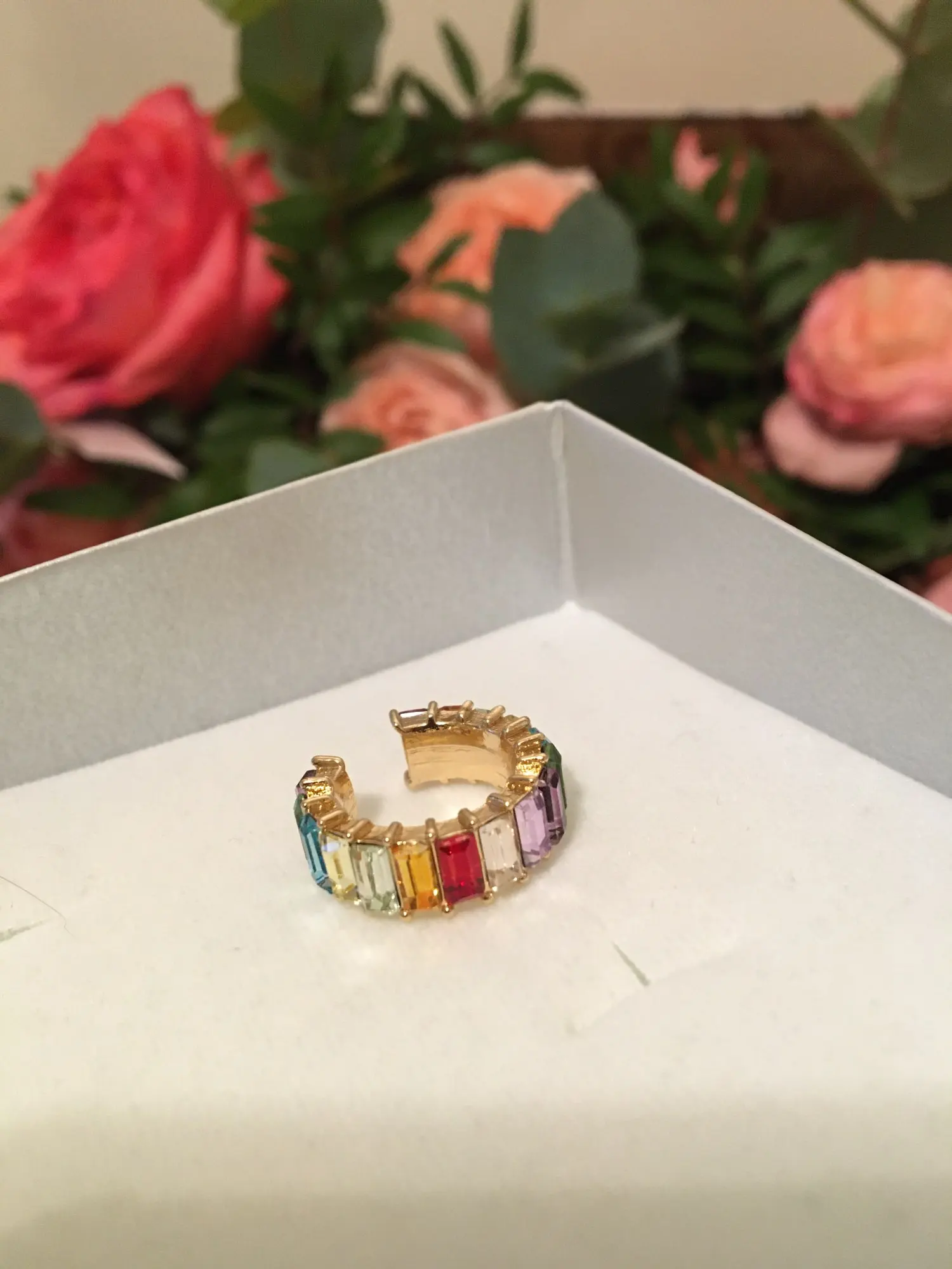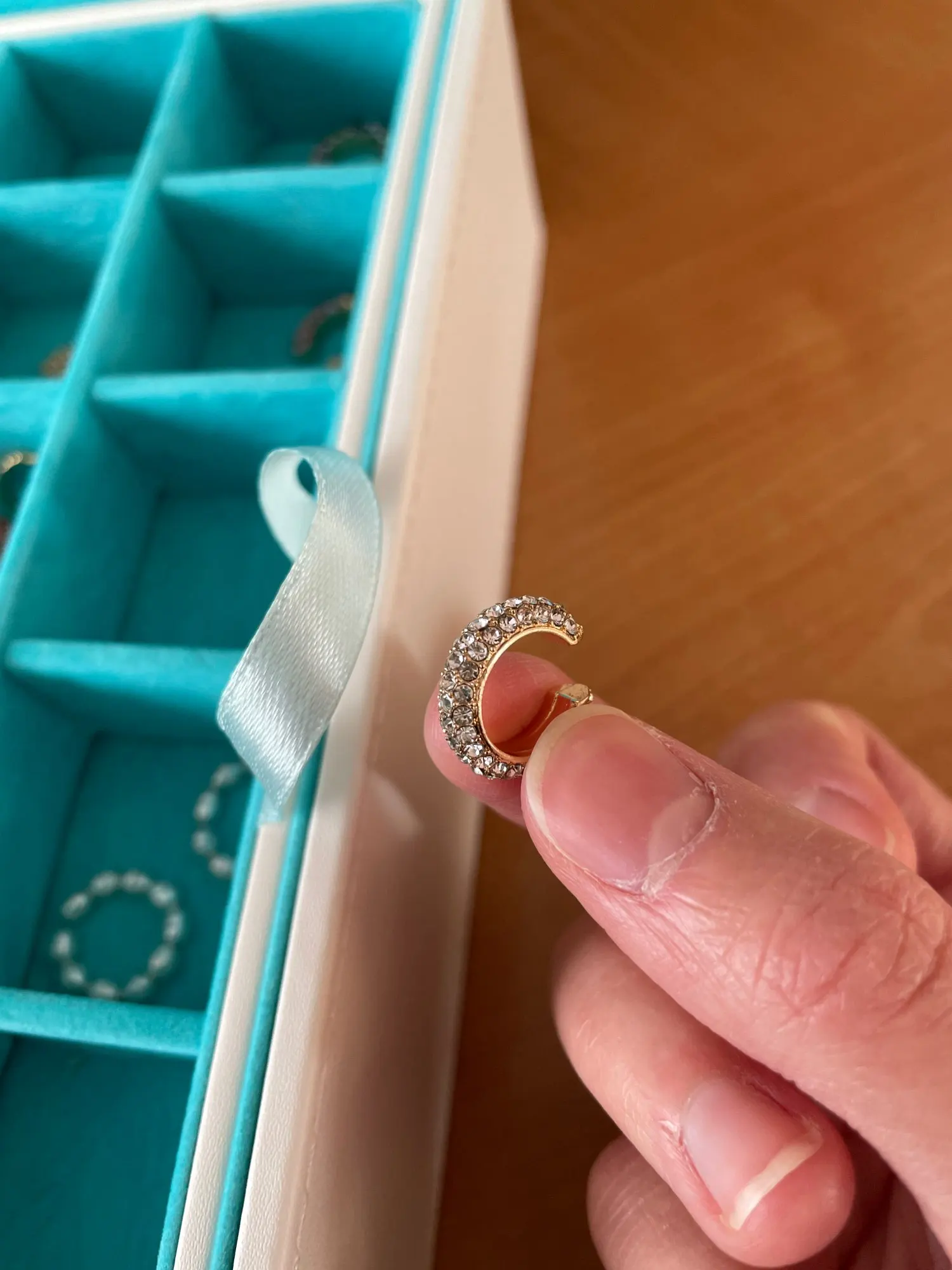 Шло больше месяца, одного камушка не оказалось, только клей) в упаковке тоже его нет, поэтому приклеить не получится. надевать мне было тяжело, слишком узко, пришлось раздвигать вручную, в целом смотрится красиво