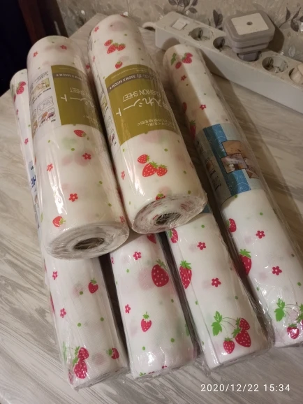 Очень практичные салфетки. Расфасовка рулоном помогает вырезать тот размер, который необходим. Доставили рулончик целым, не измятым. Расцветка соответствует заявленной. Достаточно плотный материал , который протирается тряпкой. Для кухонных ящиков и шкафчиков- идеальное решение.