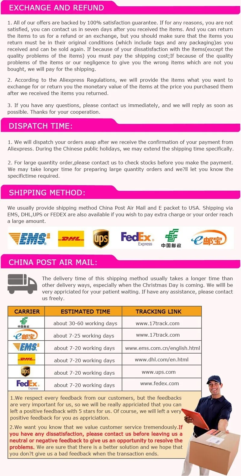 Если вы не получили посылку до окончания предстоящего периода защиты заказа, пожалуйста, свяжитесь с нами, чтобы продлить срок доставки. Если у вас есть какие-либо вопросы, комментарии или хорошая идея, пожалуйста, свяжитесь с нами.Большое спасибо еще раз!Мы обещаем клиентам: