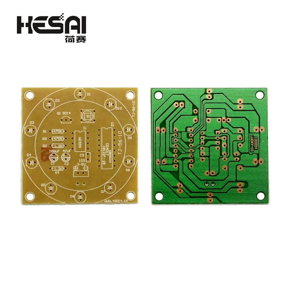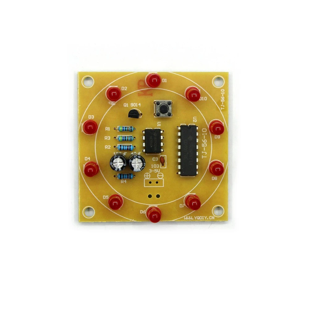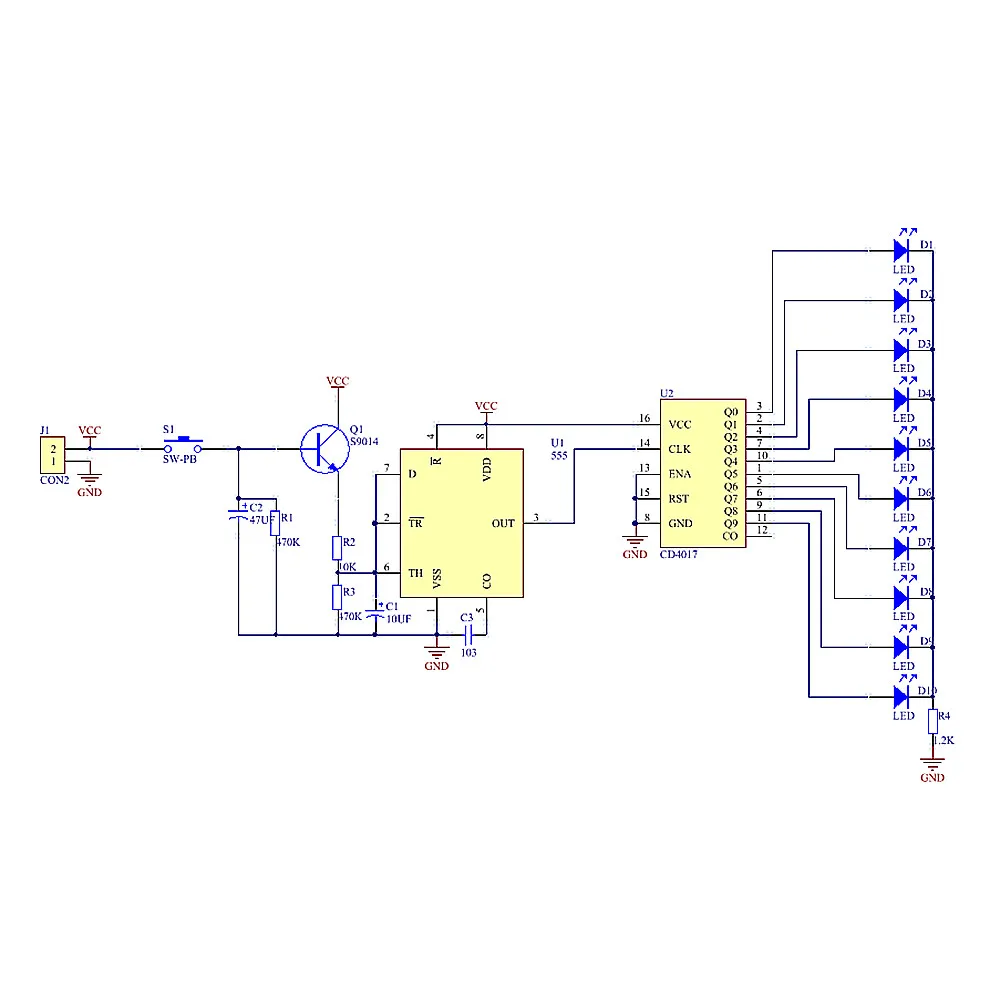 Принцип цепи: цепь в основном состоит из генератора импульсов и цепи десятичного счетчика. Импульсный генератор состоит из NE555 и периферийного компонента мульти гармонического генератора, когда кнопка Q1 нажата, S1, NE555 3-контактный выходной импульс, 10 выходов CD4017 превращает выход драйвера высокого уровня в светильник светодиодный Дов. После ослабления кнопки, и из-за наличия конденсатора C1 Q1 не сразу останавливается, при падении напряжения на обоих концах C1, в1 через программу постепенно ослабевает, три фута выходной импульсной частоты медленно, светодиодная движущаяся частота замедляется. В конце разряда С1. В1 отключение, NE555 3 фута больше не импульсный выход, светодисветодиодный перестает двигаться. Процесс "лотереи" завершен. Скорость светодисветодиодный да R2, C1 решил подождать время «лотереи».
