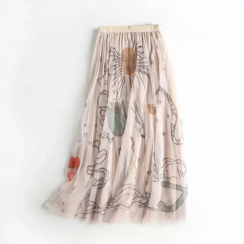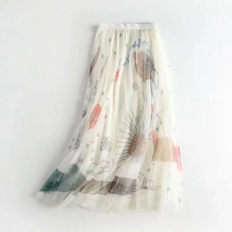 Женская длинная сетчатая юбка, черная, белая, розовая пляжная юбка с принтом и поясом на резинке, WF0091, лето размера плюс