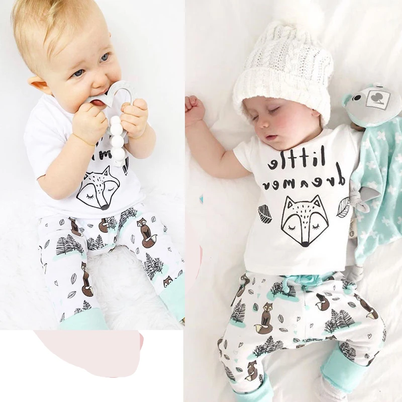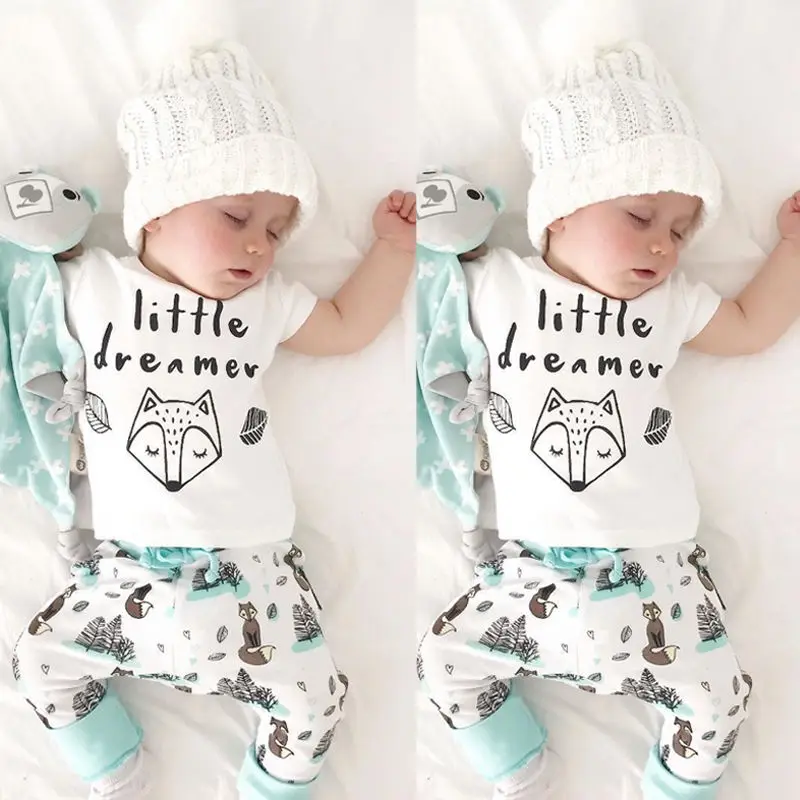 Комплект одежды для новорожденных мальчиков и девочек, футболка с милым принтом + штаны с цветочным принтом, 2 шт.