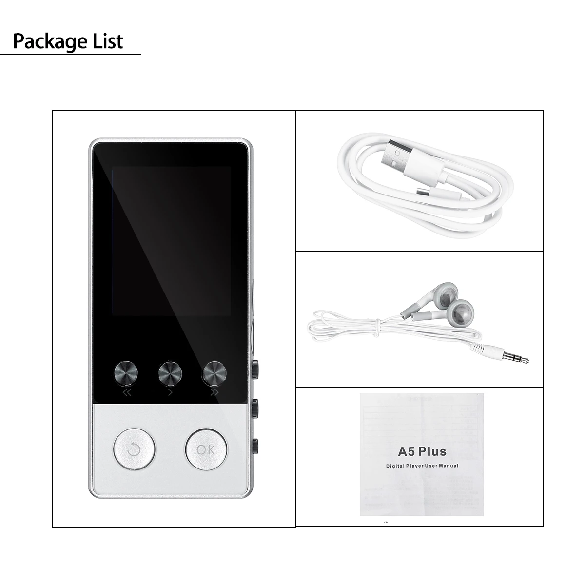 Спецификация:Название: спортивный MP3-плеер с bluetoothМодель: A5Материал: металлВстроенная память: 8 ГбЭкран: 1,8 дюймовый TFT-экранВерсия bluetooth: 4,2Мощность аккумулятора: 400 мАчВремя зарядки: около 2 часовВремя воспроизведения: около 10 часовФормат записи: MP3/WAV (32K bps / 64K bps)Формат воспроизведения: MP3/WMA/WAV/APE/FLAC/OGG/ACCФормат видео: AMV/AVIФормат чтения: TXTПоддержка TF-карты: Максимум 128 ГБ (TF-карта не входит в комплект)Язык: 27Размер: 89*40*9 мм/3,5*1,6*0,4 дюйма