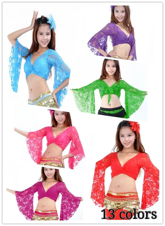 Женский топ для танца живота, Кружевной укороченный топ с глубоким V-образным вырезом и расклешенными рукавами, 13 цветов