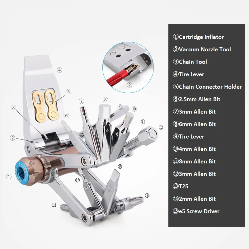 New 16 in 1 Multi-functional MTB Bicycle Repair Tool Set Bicycle Chain Tool Cartridge Inflator Hex Socket Mini Bike Tool Kit