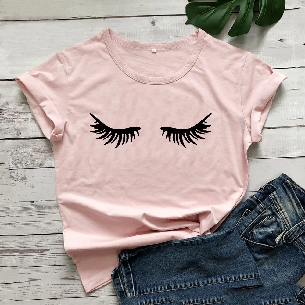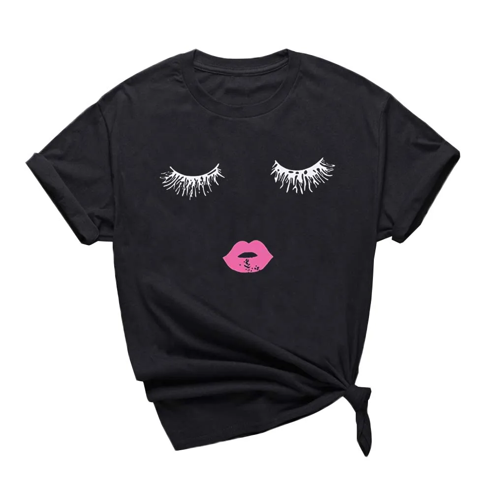 Футболки с рисунком ресниц, Женская хлопковая футболка с коротким рукавом и круглым вырезом, женская черная белая футболка, женский топ, Повседневная Свободная футболка для женщин