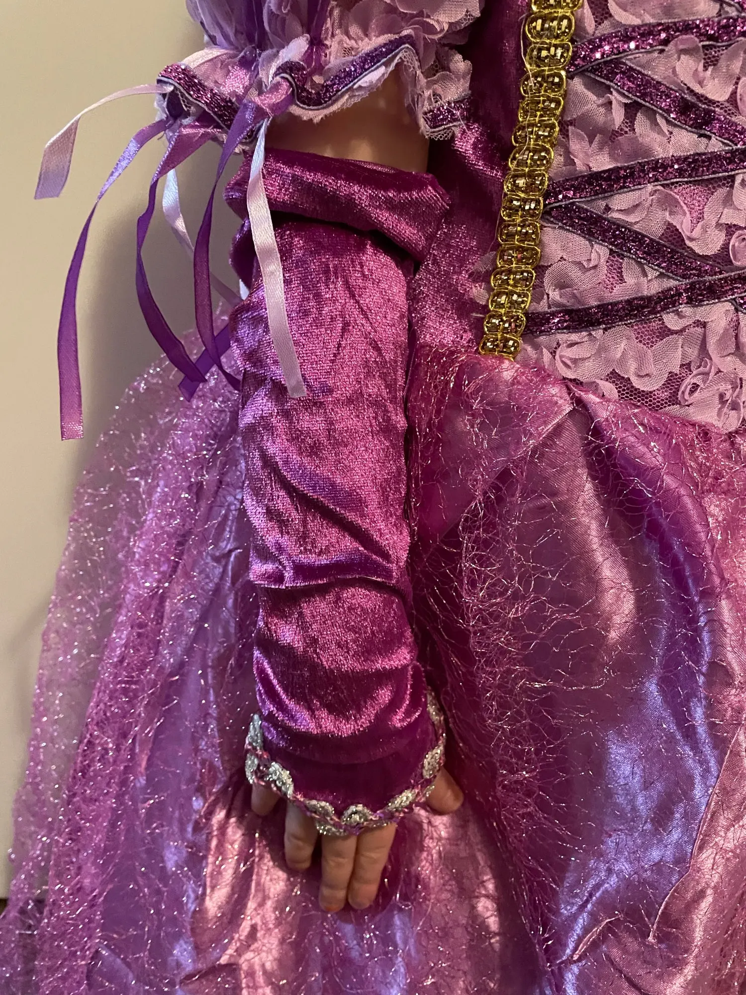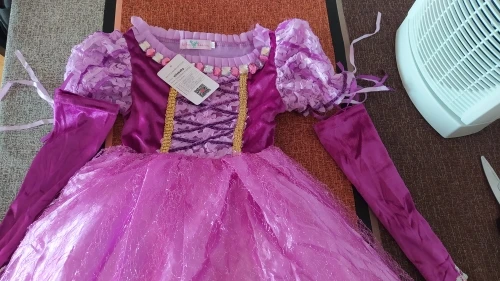 Платье отличное. На девочку 8 лет с ростом 125 брали 9 размер. Подошло отличьно. Качество хорошее. Юбка пышная, как будто под ней каркас. Дочка без ума. Рукава одут отдельно и это удебно, можно играться с длинной. Парик не особо понравился, думали будет длинный почти до пола, а он немного ниже попы. Вобщем советую продовца и костюм. Спасибо
