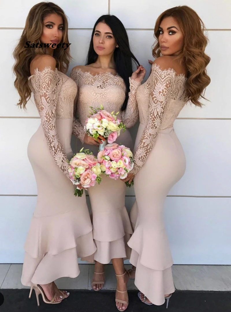 Женское платье с юбкой-годе, розовое атласное кружевное платье подружки невесты с открытыми плечами и длинным рукавом