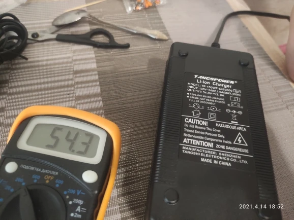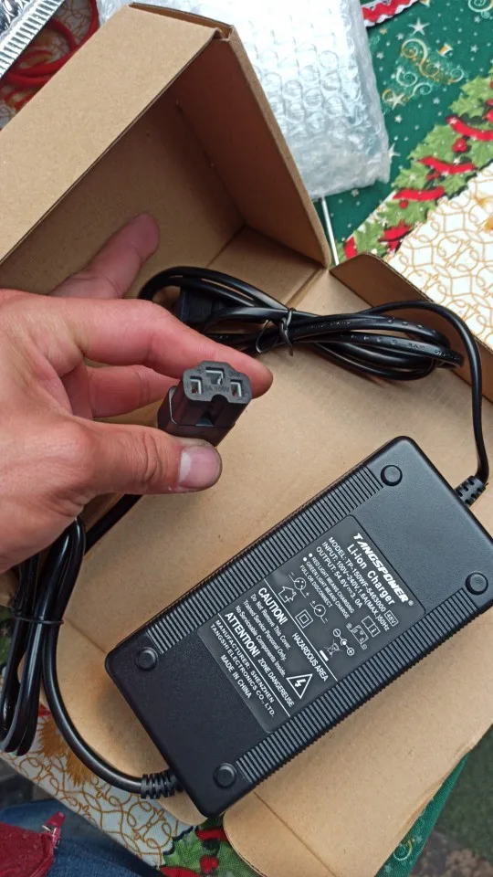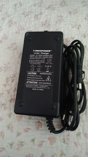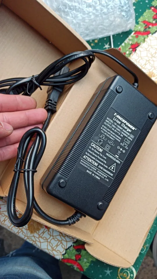 Зарядник дешёвенький ,пластмасса того и гляди рассыпется ,напряжение на холостом ходу 54,2 ,под нагрузкой просядит 100% , будет где то 53 вольта .Провода очень тоненькие и изоляция жеская ,думаю что со временем их придется заменить.Пока батарея еще в пути проверить не могу.Не нашел на нем болтов как его разобрать что бы потом можно напряжение выставить резистором . Так что не уверен в его нажежности ...