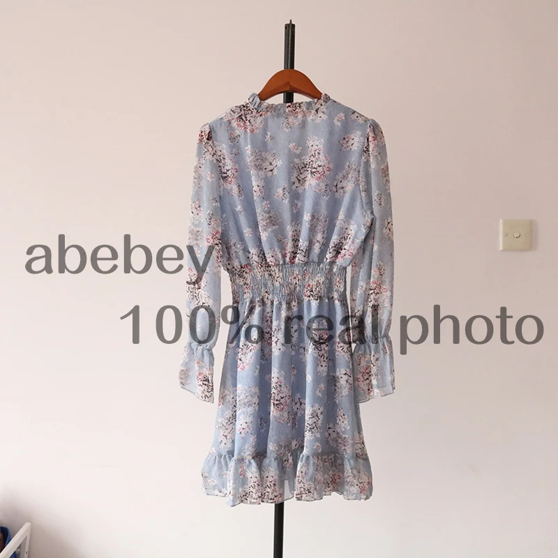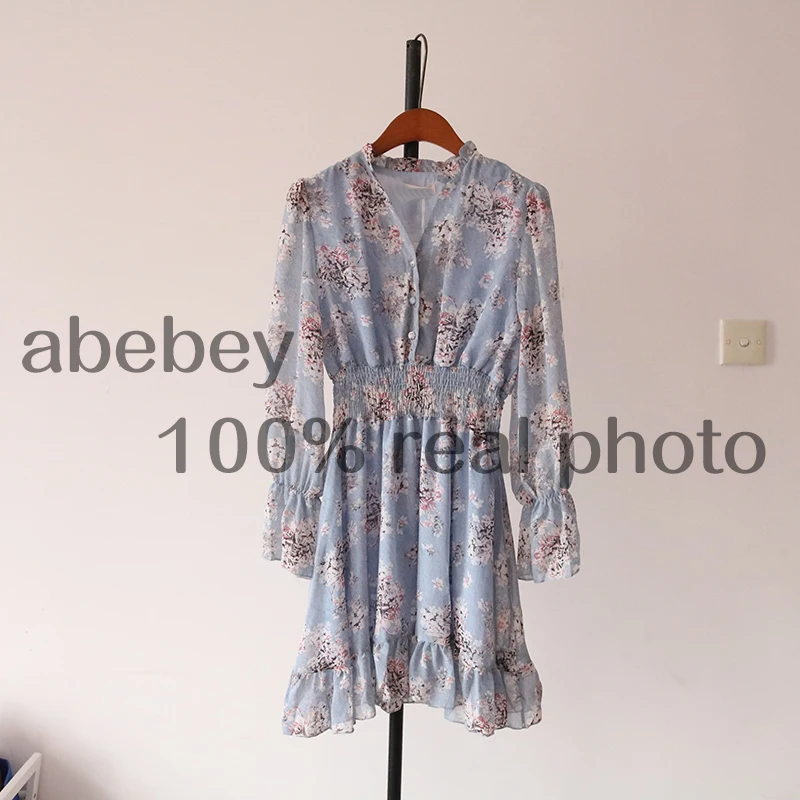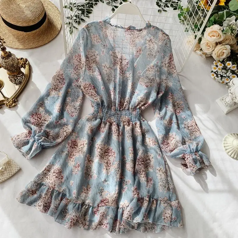 Женское шифоновое платье с цветочным принтом, элегантное платье во французском стиле с V-образным вырезом и длинными рукавами, новинка 2022
