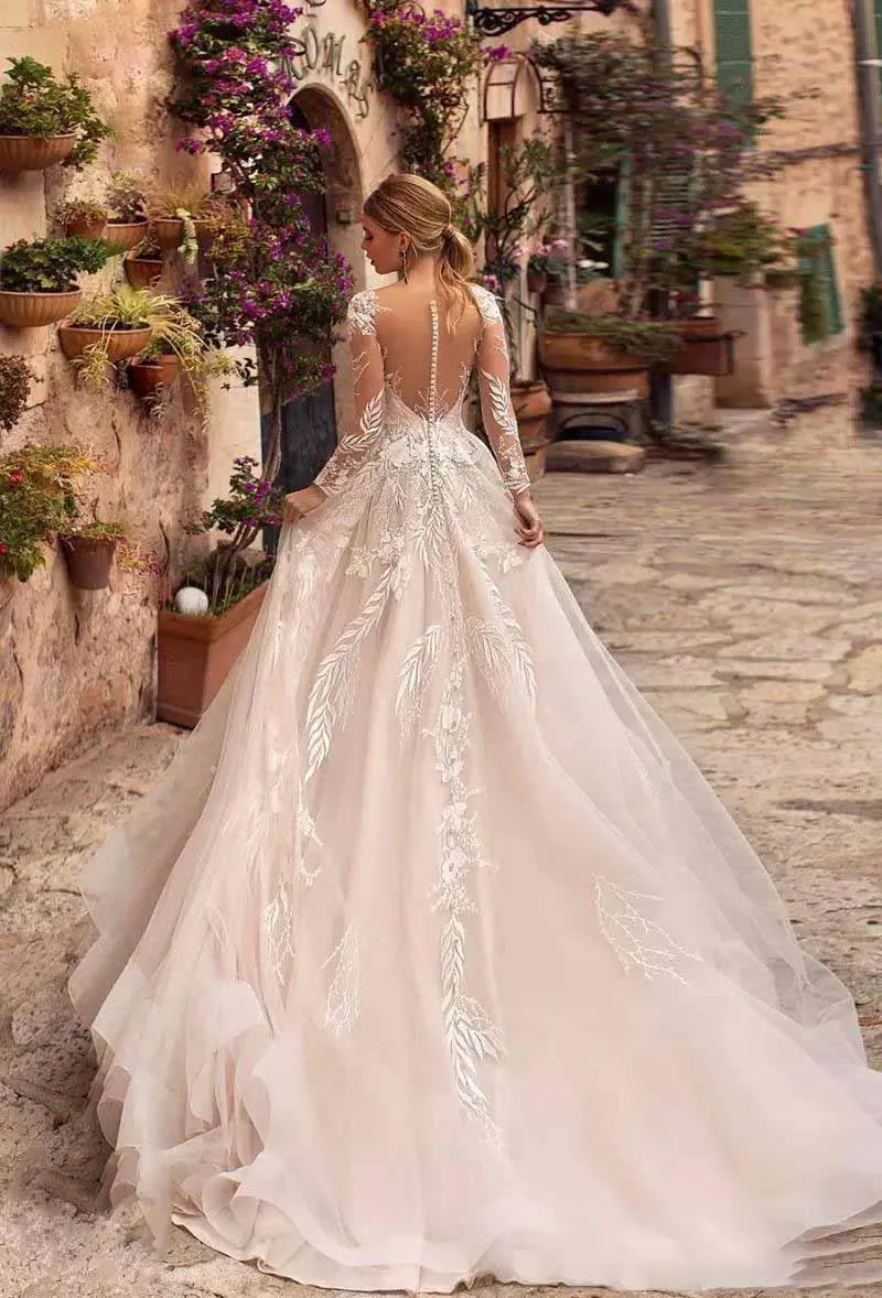 Кружевное бальное платье с длинными рукавами и открытой спиной