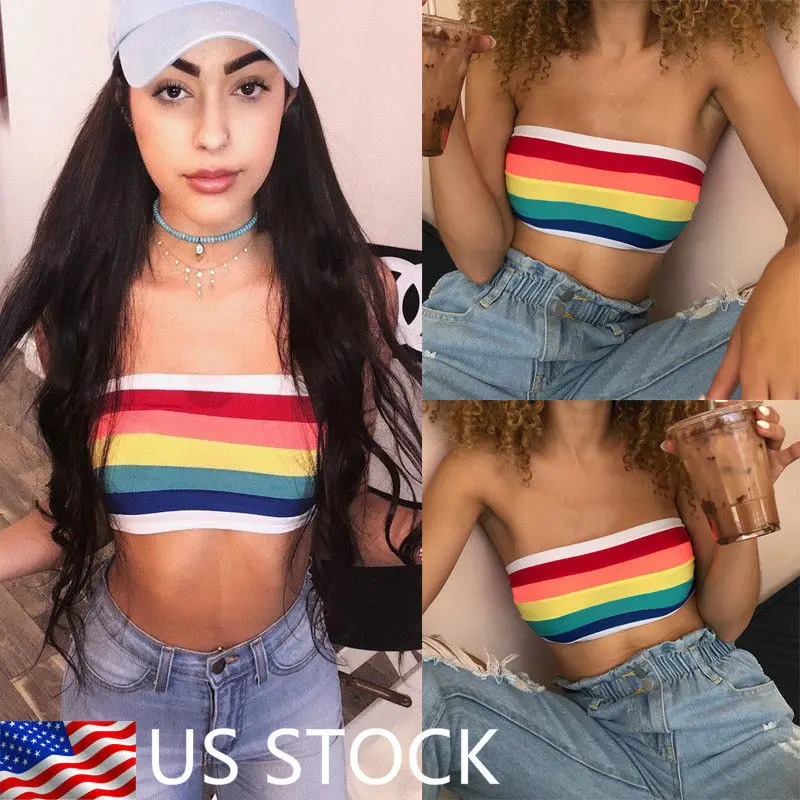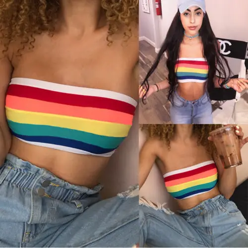 Женский топ-бандо без бретелек, модный топ в радужную полоску, Топ без бретелек, Женский Топ