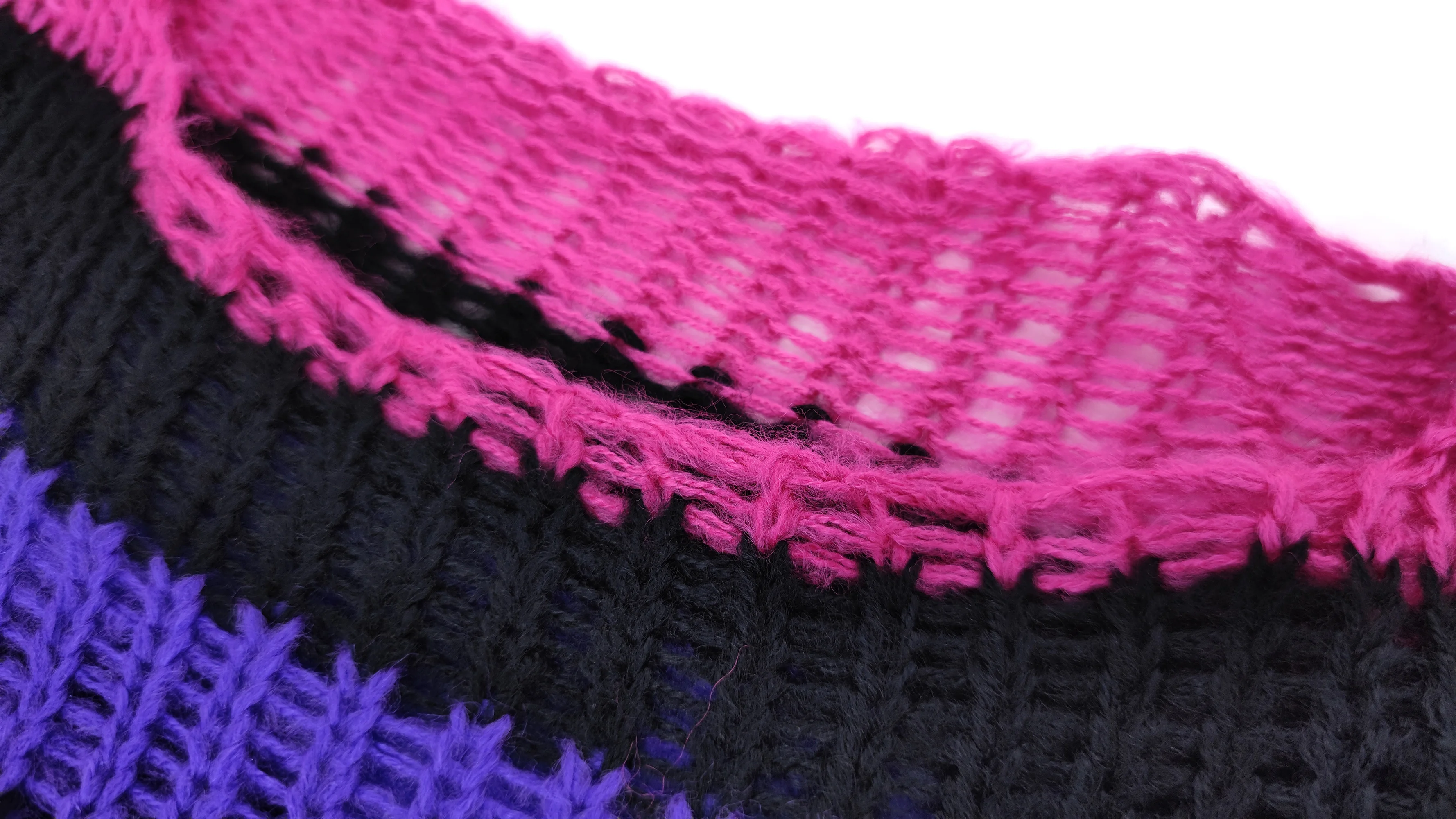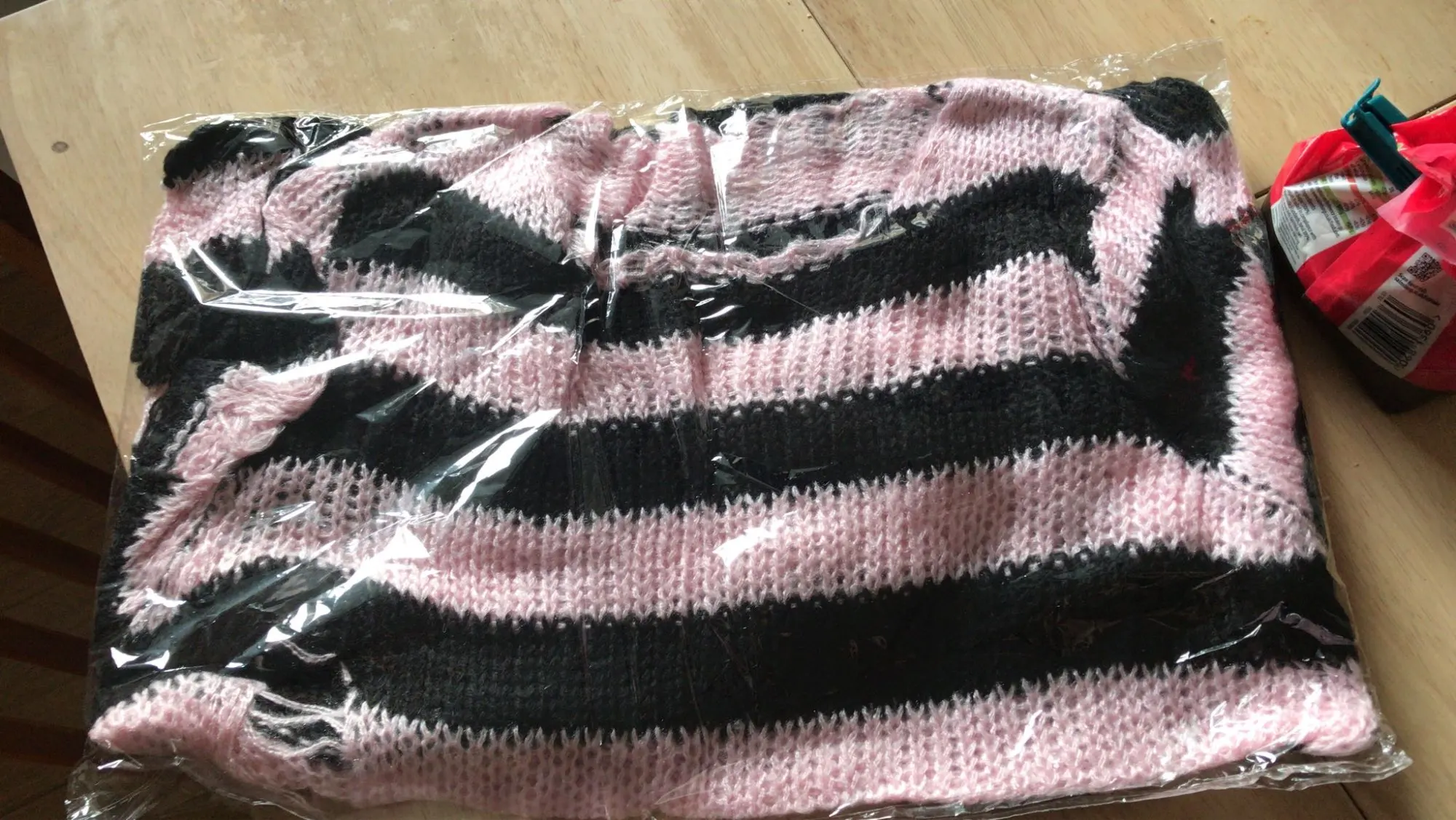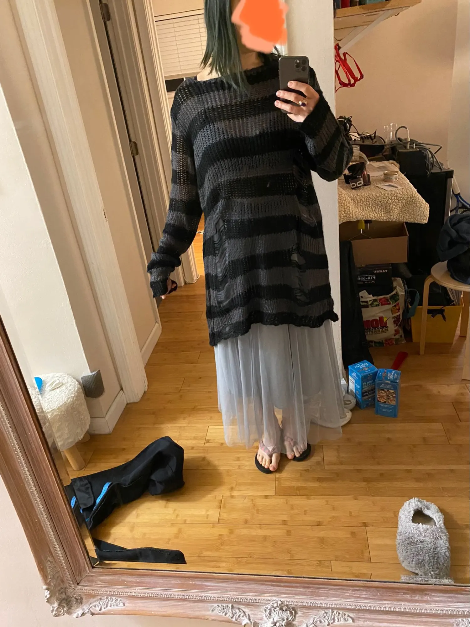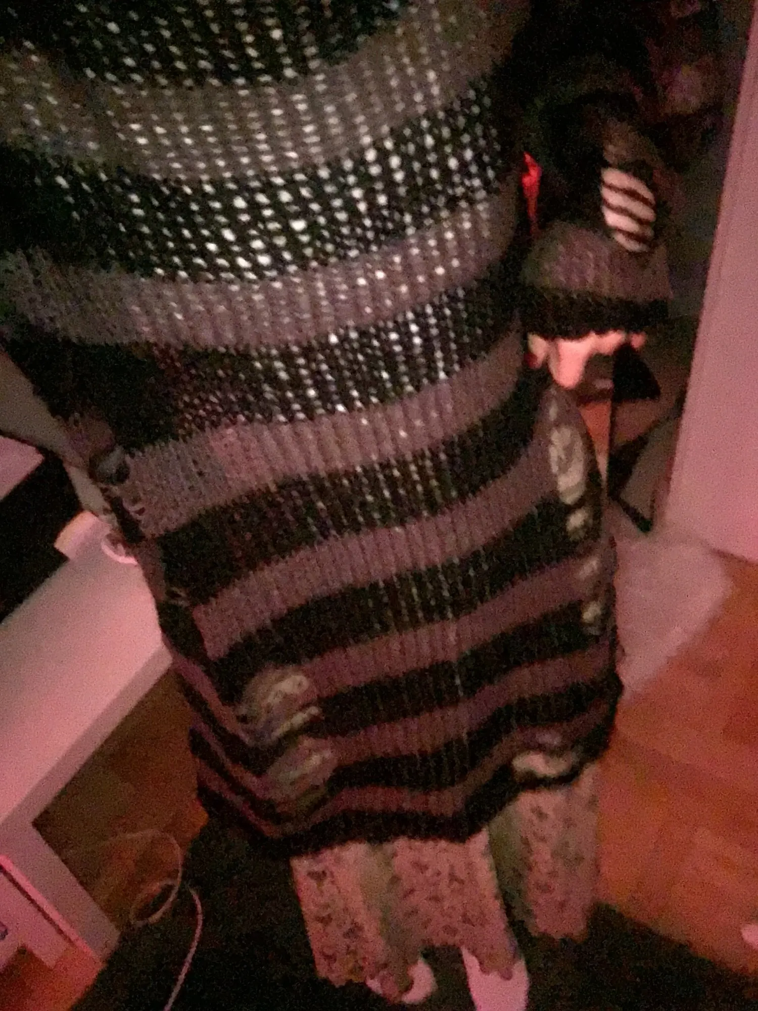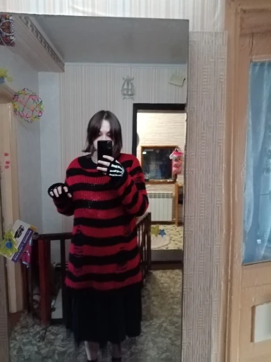 Свитер очень тонкий, но теплый вообще. И он просто огромный, на рост 164 до колена и даже немного с плеч спадает. Выглядит прикольно, дыры провязаны адекватно - дальше не распустятся. Под него надо что-то надевать - прозрачный