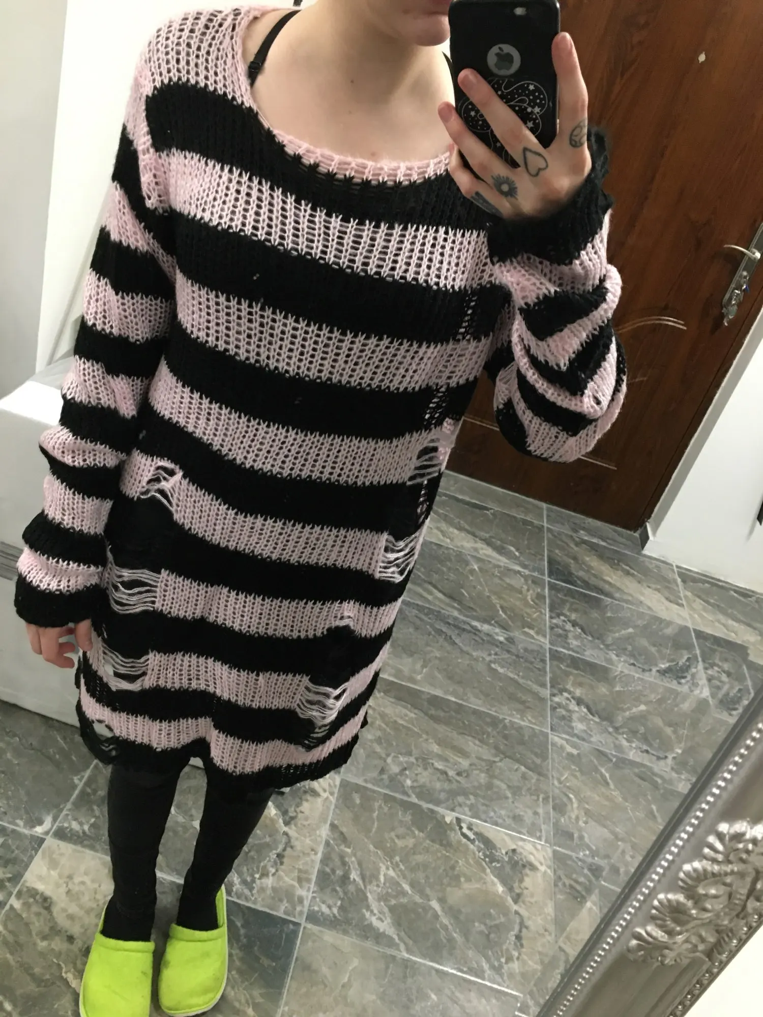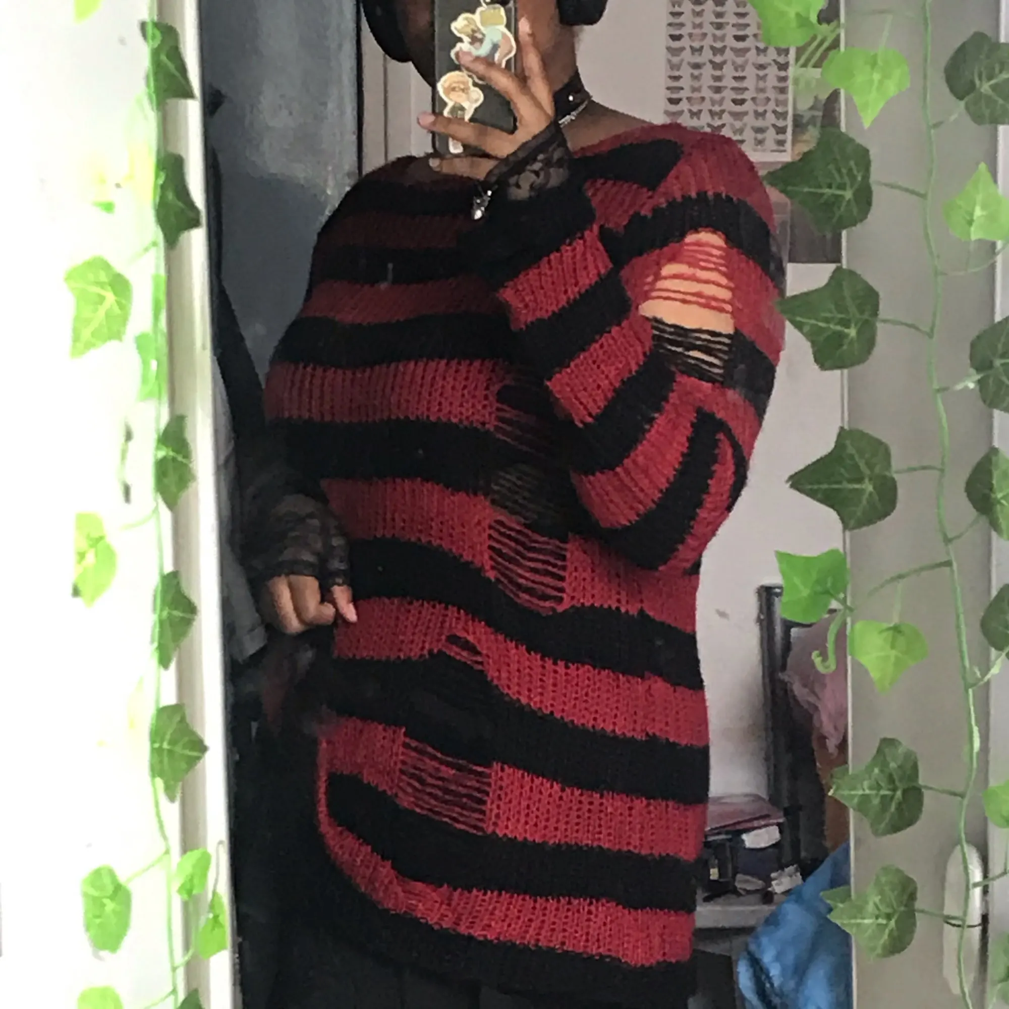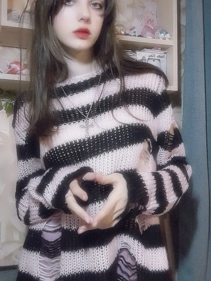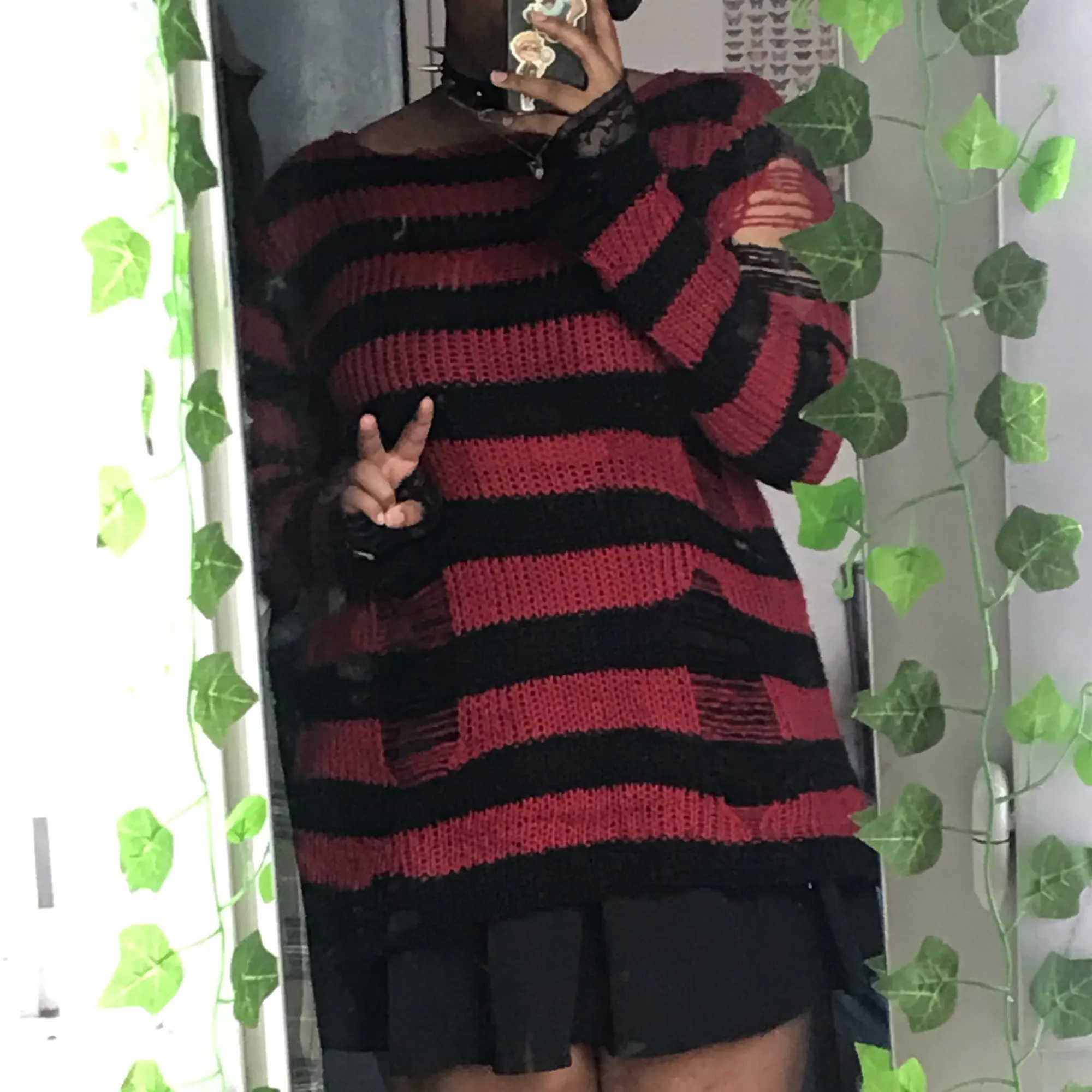 Женский свитер в стиле панк-готика, свободный тонкий черный джемпер в полоску с вырезами, в стиле рок, лето 2020