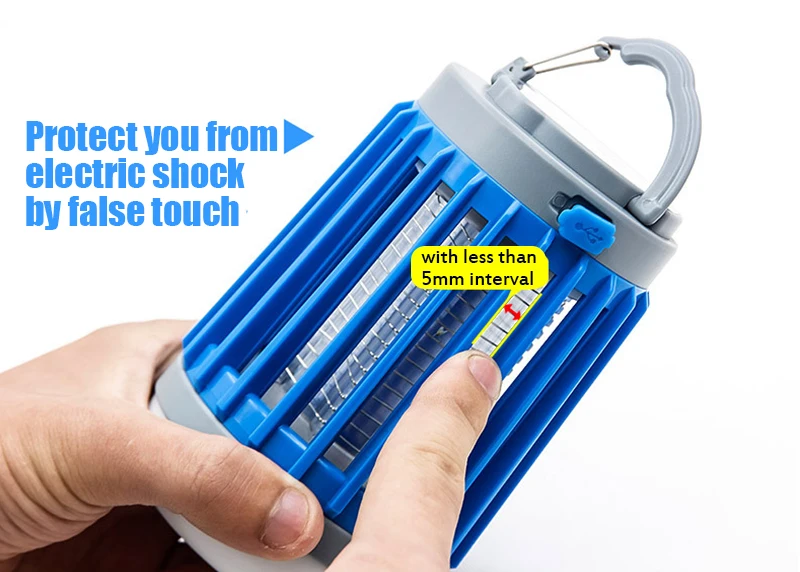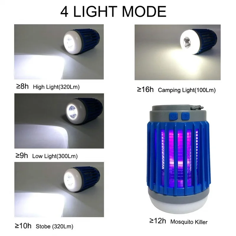 √ 3 в 1 многофункциональная-наружная лампа zapper-это комбинация фонаря для кемпинга, УФ-лампы для уничтожения комаров и аварийных ламп. √Safe эффективный насекомое Zapper-Специальный яркий 360nm-390nm фиолетовый ультрафиолетовый светильник, физический метод привлечения и устранения насекомых. Безопасно для здоровья человека и окружающей среды. √ Водонепроницаемость IP67-не беспокойтесь о дождливых днях. Портативный идеально подходит для использования в помещении и на открытом воздухе. √Фонарь для кемпинга имеет портативный крючок-Откройте крючок, и его легко повесить. И при улавливании комаров эффект подвешивания будет лучше. √ 4 режима работы-нажмите кнопку «светильник ing», лампа изменится на 4 режима: светильник-светильник SOS-высокая яркость-Низкая яркость