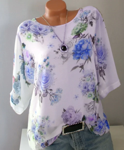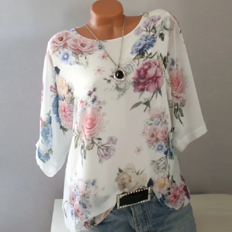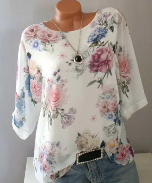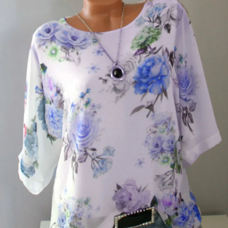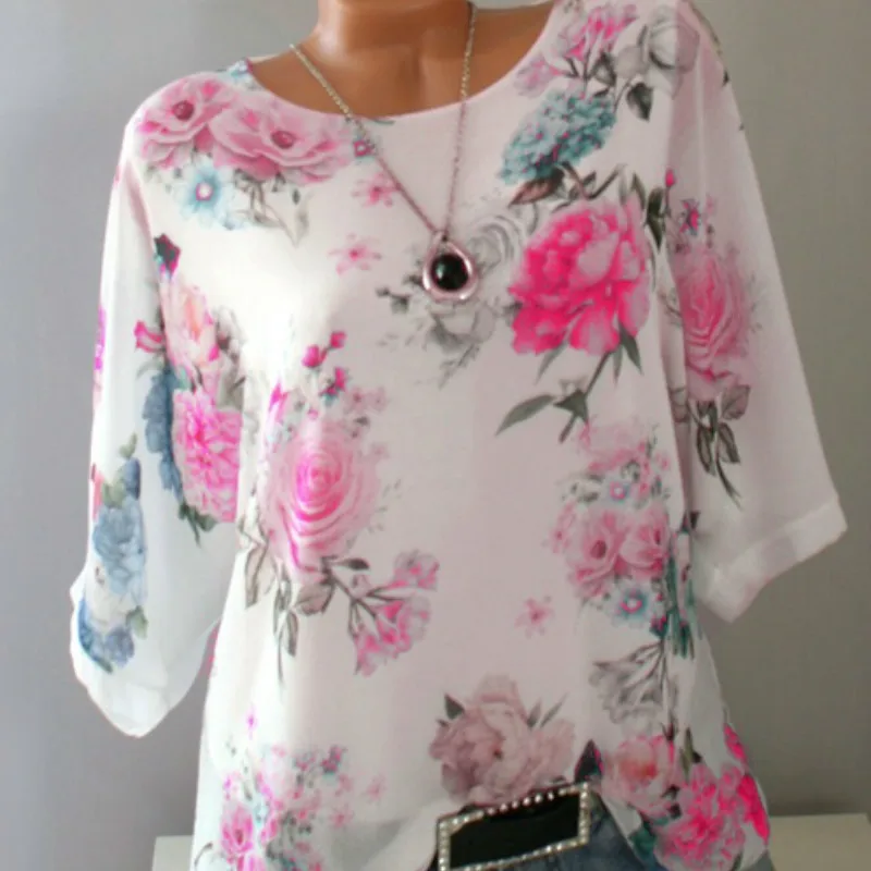 Женская шифоновая блузка, с коротким рукавом и цветочным принтом, элегантная белая летняя блузка, 5XL, размера плюс