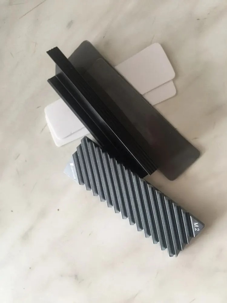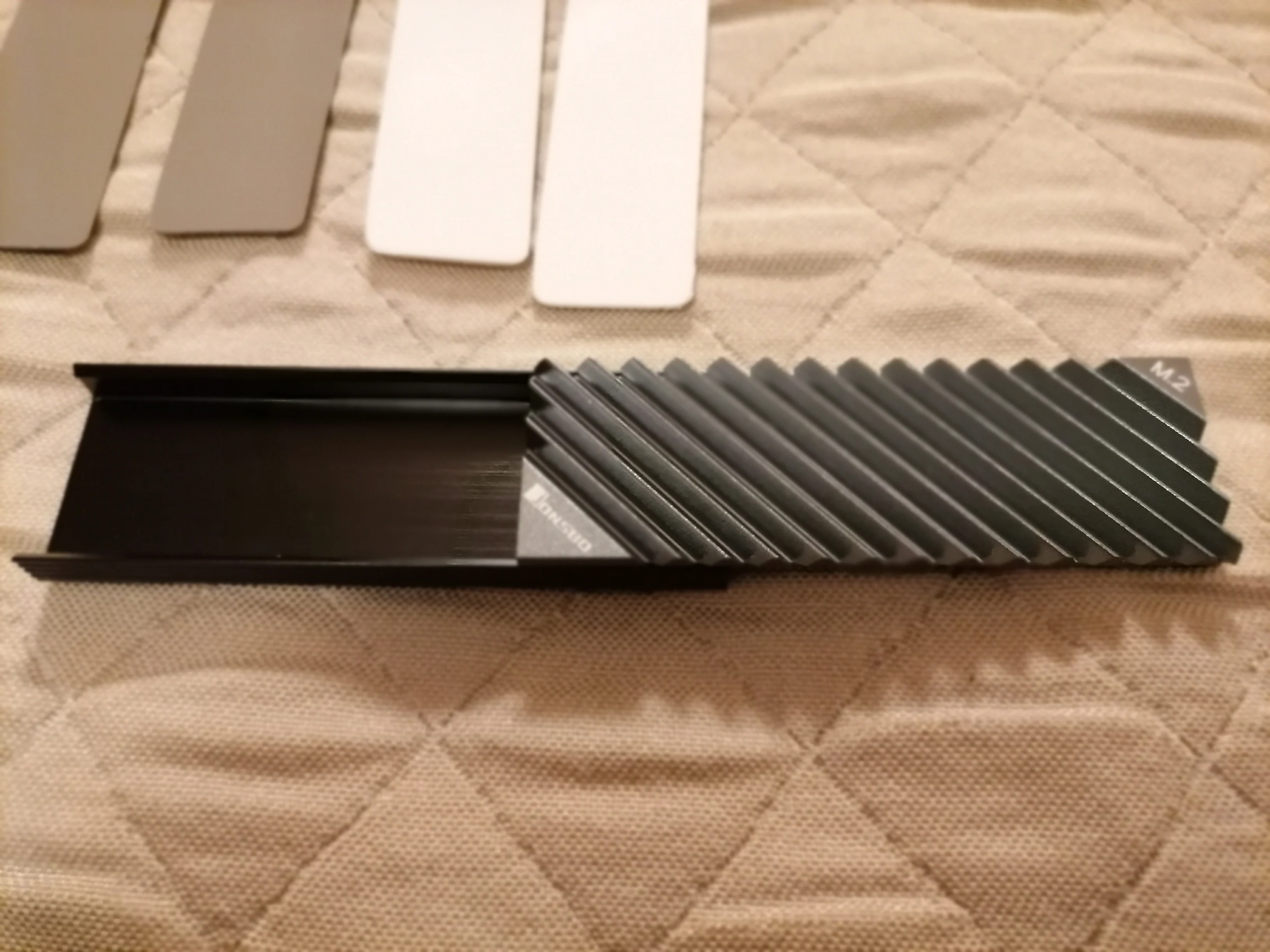Просто нормальный радиатор. Ничего необычного. Пока не тестил, так как ssd ещё не пришёл, но думаю справится. Термопрокладки есть, и их 4 штуки (2 чёрный, 2 белые).