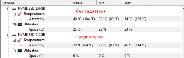 10 градусов под максимальной нагрузкой отыграл. С небольшим обдувом вентилятора вышло на 15. ssd kingston a1000 nvme 240 гб.
