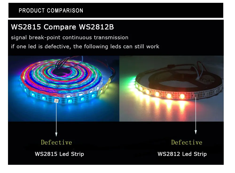 Примечание:1. Цена только Светодиодная лента, не включает блок питания или светодиодный контроллер!2.WS2815 должен использовать блок питания DC12V и светодиодный контроллер управления для управления!3. Каждый 0,5 метр с Паяные соединения, пожалуйста, обратите внимание!4. Если заказ не более $5, номер отслеживания нет!Широкая совместимость:Может управляться Arduino, Raspberry Pi, Fadecandy, K1000C, SP105E, SP107E, SP110E и т. Д.12V WS28115 Светодиодные ленты:Светодиодный фонарь WS2815 обновленная версия 5V WS28113 светодиодный. Для 5 м светодиодный полосы, даже если все светодиодный s включены полностью белый, 12 В версия не имеет падение напряжения. Вам не нужно вводить питание так часто, как версия 5 В.Индивидуально адресуемый:Каждый пиксель может иметь свой собственный цвет и яркость. Вы можете управлять им индивидуально и устанавливать их на любой цвет или анимацию. 256 яркости дисплея и 24-битный цветной дисплей.Двухсигнальные провода:WS2815 светодиодный полосы похож больше нравится версия 5V WS2813 светодиодный полосы, разработанный с одна жила провода для передачи данных и резервного копирования данных провода. Непрерывная передача сигнала. Если поврежден один светодиодный индикатор, может работать следующий светодиодный индикатор.Характеристики:Тип ИС: WS2815 ICСерый уровень: 256Угол обзора: 120 °Входное напряжение: DC12VЦвет: полный Цвет 24 битЦвет платы FPCB: белый/черныйМощность: 0,3 Вт/светодиодный 30/60/144 светодиодный s/mМодель: WS2815 полоса 5050rgb чипыКол-во светодиодов: 30/60/144pcs RGB SMD 5050 на метрДлина волны (нм): красный, 650нм; Зеленый, 520нм; Синий, 460нмУровень водонепроницаемости:IP30: не водонепроницаемыйIP65: водонепроницаемое силиконовое покрытиеIP67: водонепроницаемый в силиконовой трубкеПосылка включает в себя:1 х светодиодный (светодиодный)1 x 4-контактный разъем (5 м светодиодный разъем)