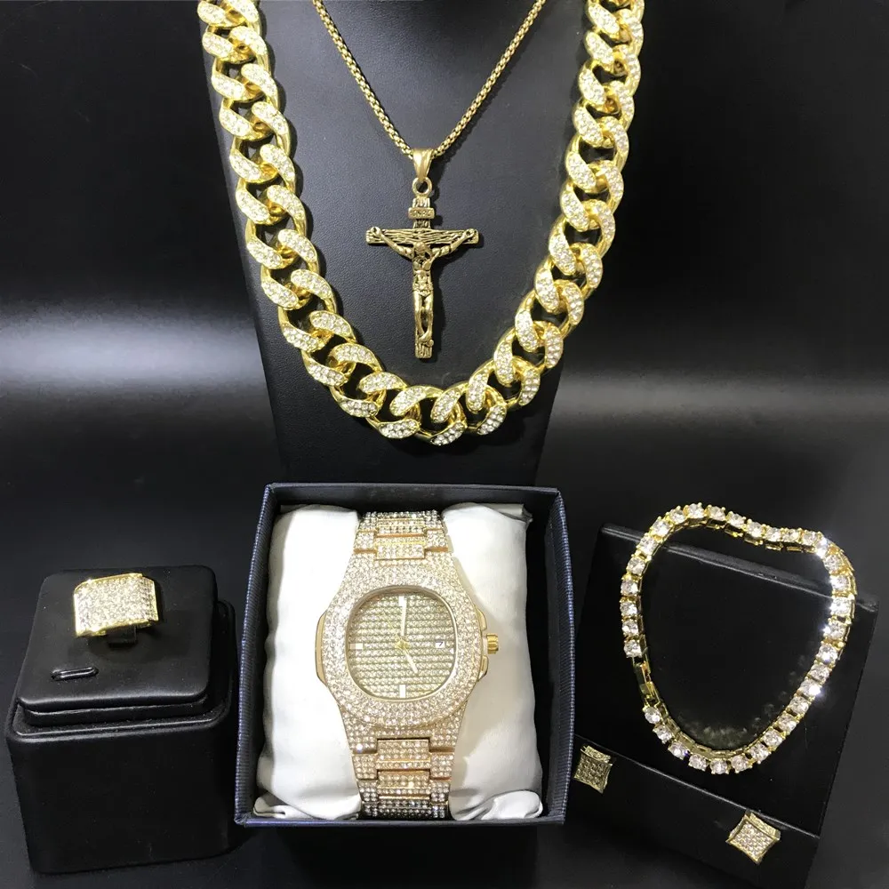 Роскошные мужские золотые часы, мужские часы, ожерелье, браслет, серьги и кольцо, комплект из кубинской бриллиантовой подвески