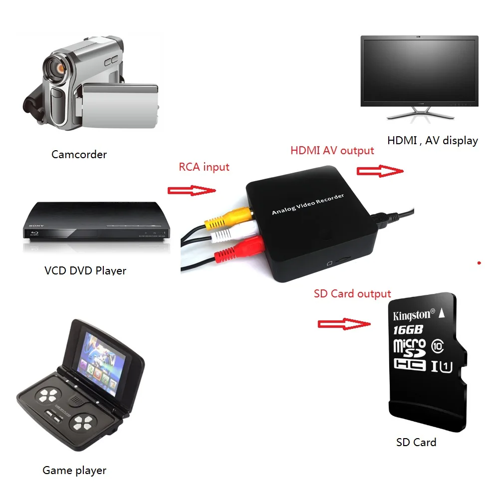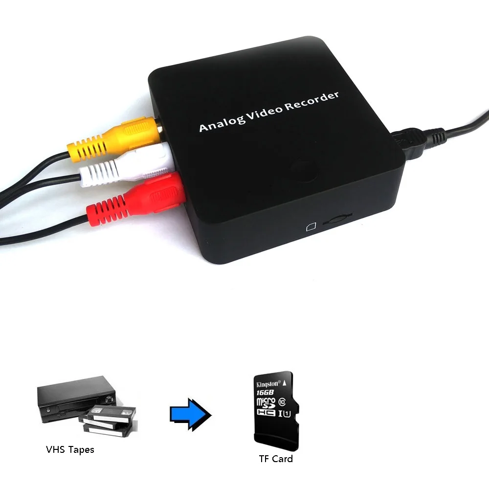 Конвертируйте все аналоговые видео в цифровое видео одним нажатием кнопки от VHS, Hi8, видеомагнитофона, видеорегистратора, dvd-плеера и игровой системы. Не требуется компьютер, записывает видео и сохраняет в Micro sd-карте напрямую. После этого вы можете быстро и напрямую поделиться файлами с нуждающимися.