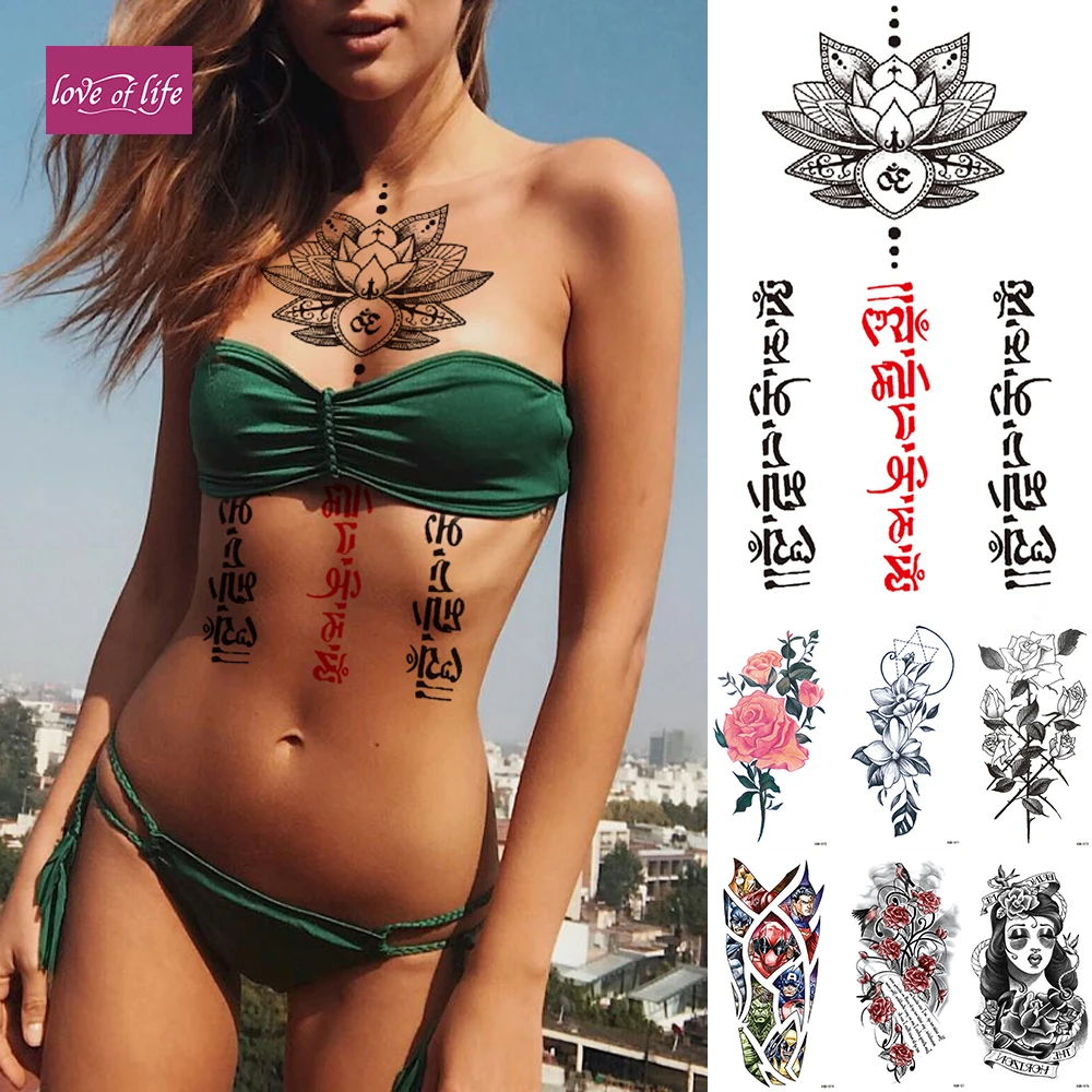 Водостойкая временная татуировка-наклейка на санскрите, лотос, флэш-татуировки, цветы, розы, кружева, тотем, боди-арт, поддельные татуировки для женщин и мужчин, 1 шт.